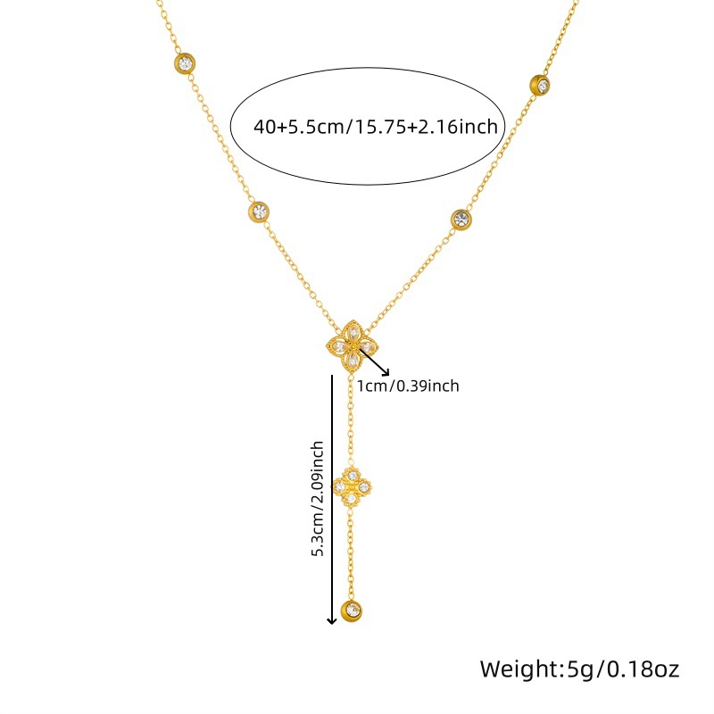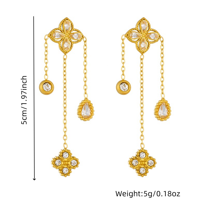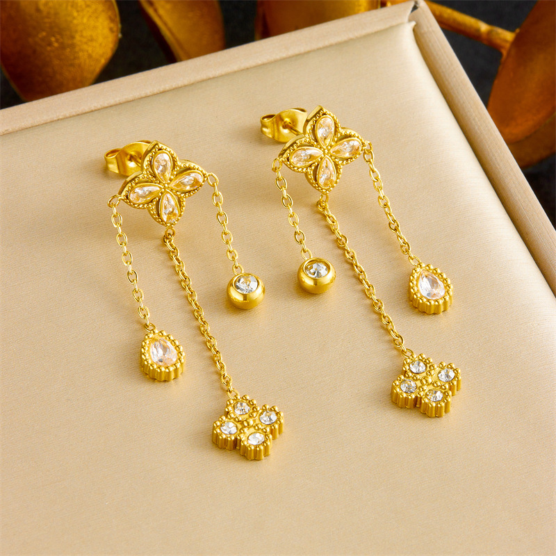 Home > New Arrival > Fashion high-end diamond-encrusted four-petal flower tassel chain pendant stainless steel bracelet earring necklace set