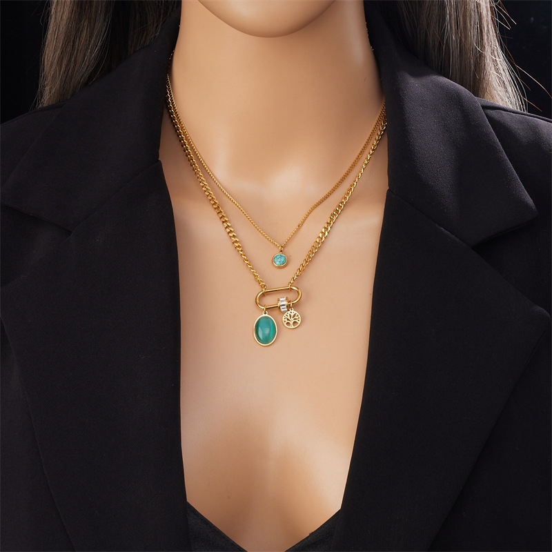 Fashion layered double chain stainless steel multi-element geometric square star tree of life snake pendant necklace
