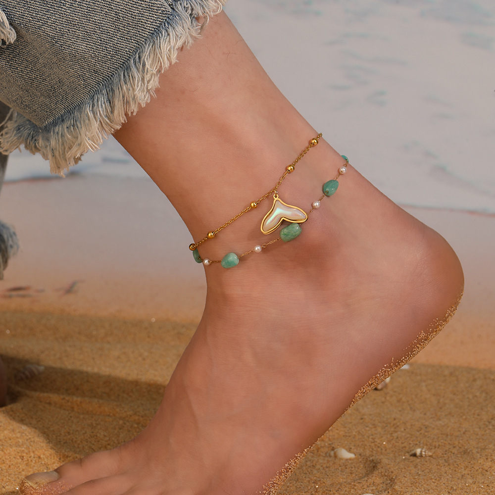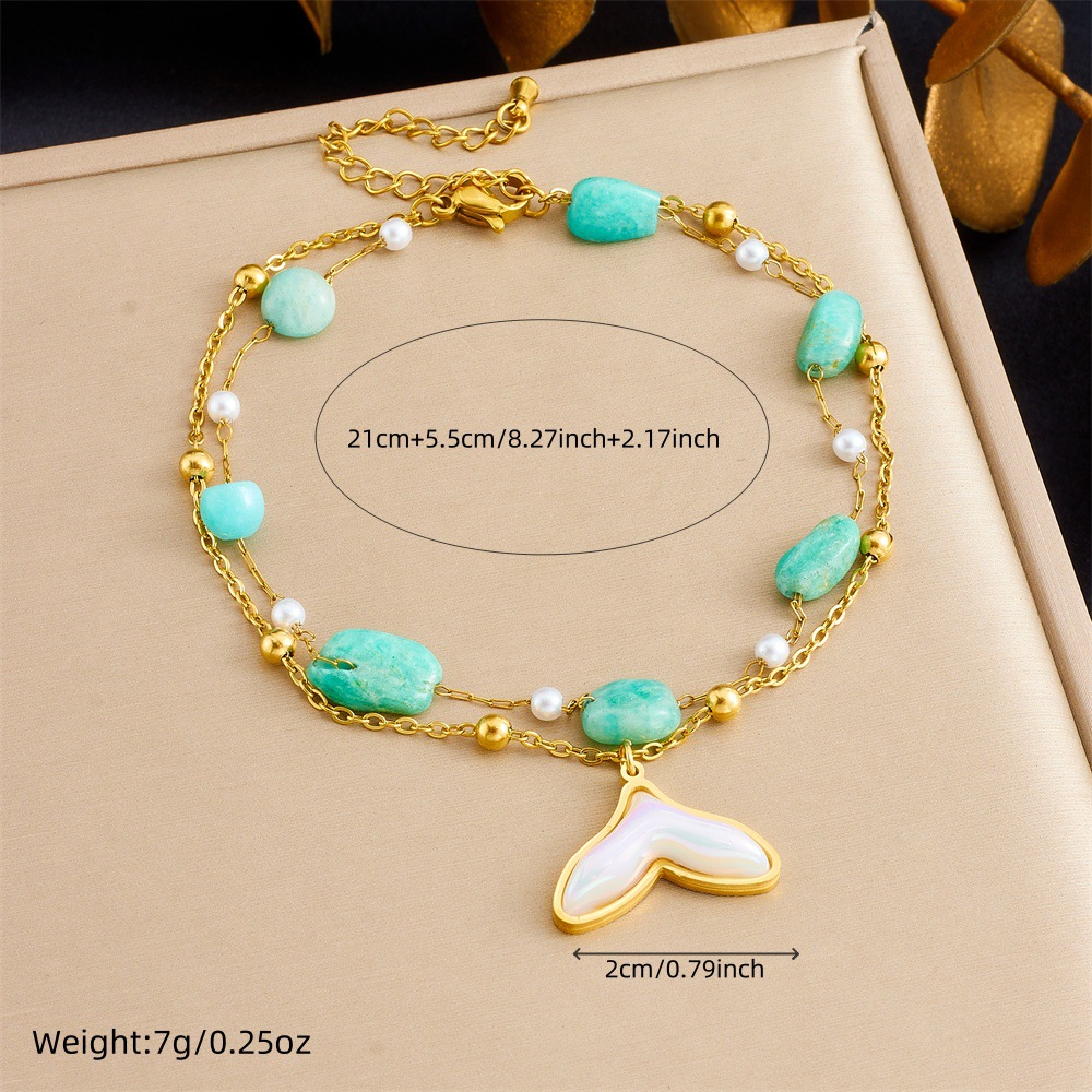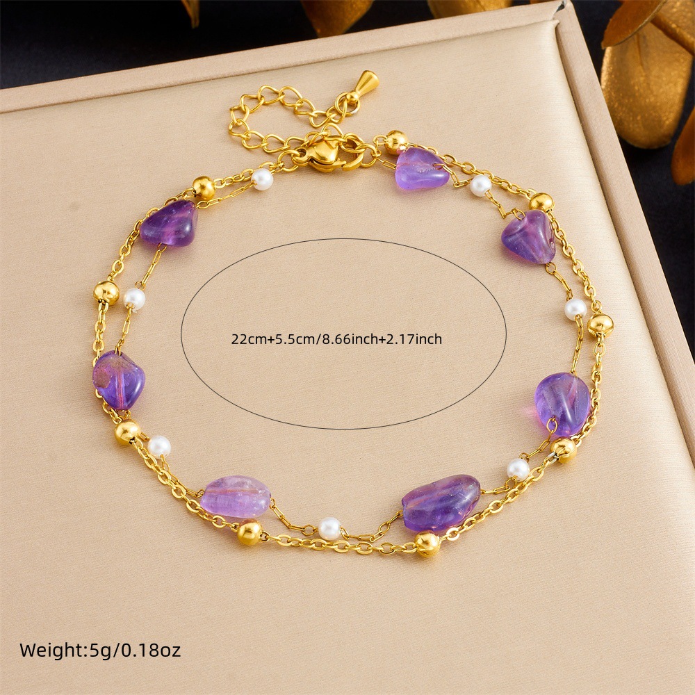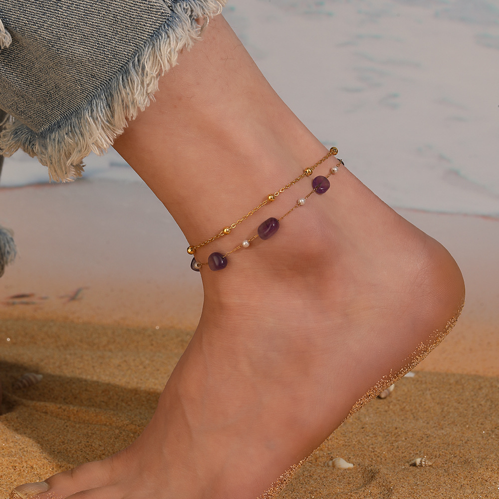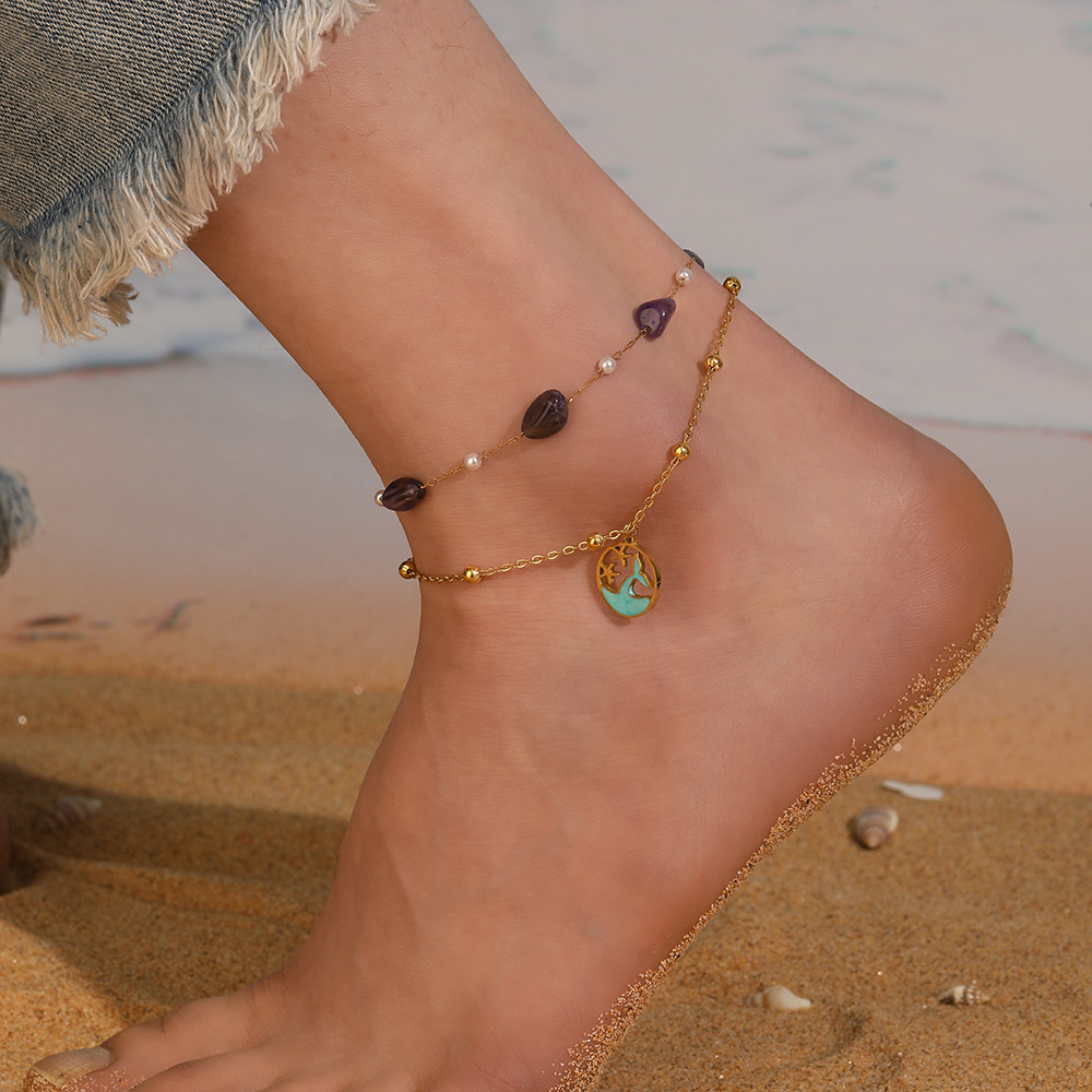 Fashion ocean style purple pebble beaded chain, double-layer stainless steel starfish dolphin fish tail anklet