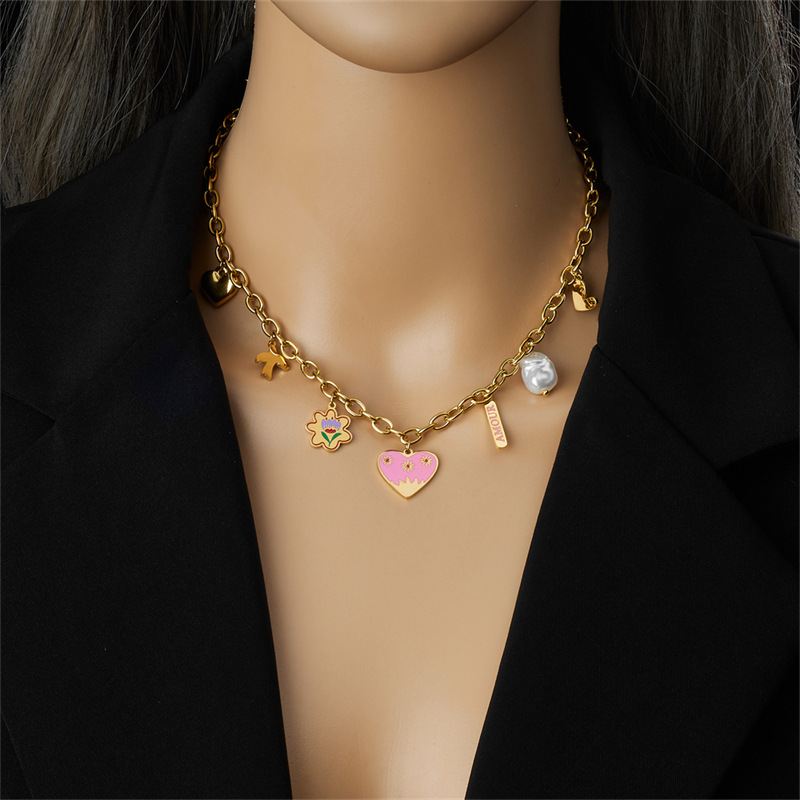 Home > New Arrival > Fashionable cartoon cute painted heart flower bird pearl pendant chain stainless steel necklace