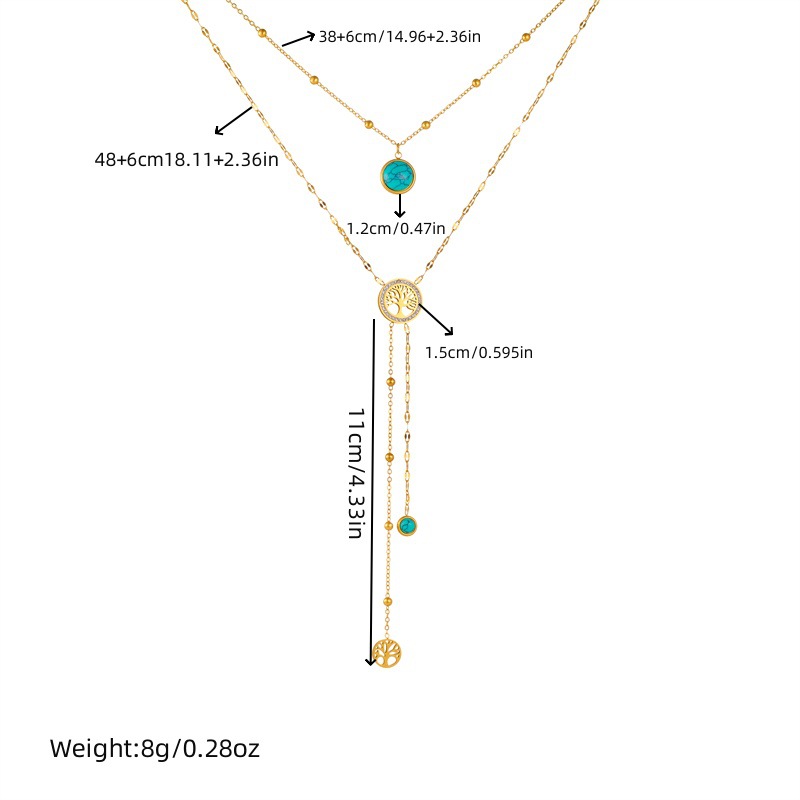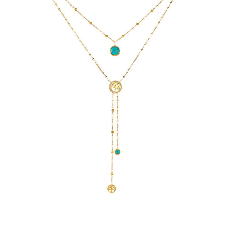Retro double-layered flower butterfly turquoise tree of life pendant chain tassel necklace