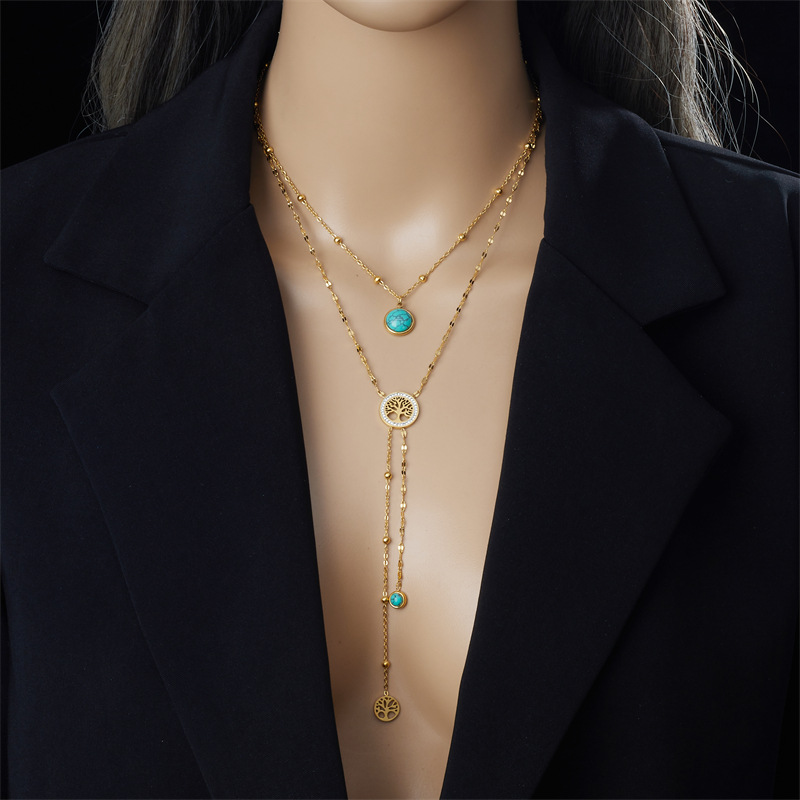 Home > New Arrival > Retro double-layered flower butterfly turquoise tree of life pendant chain tassel necklace