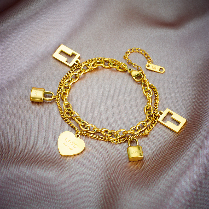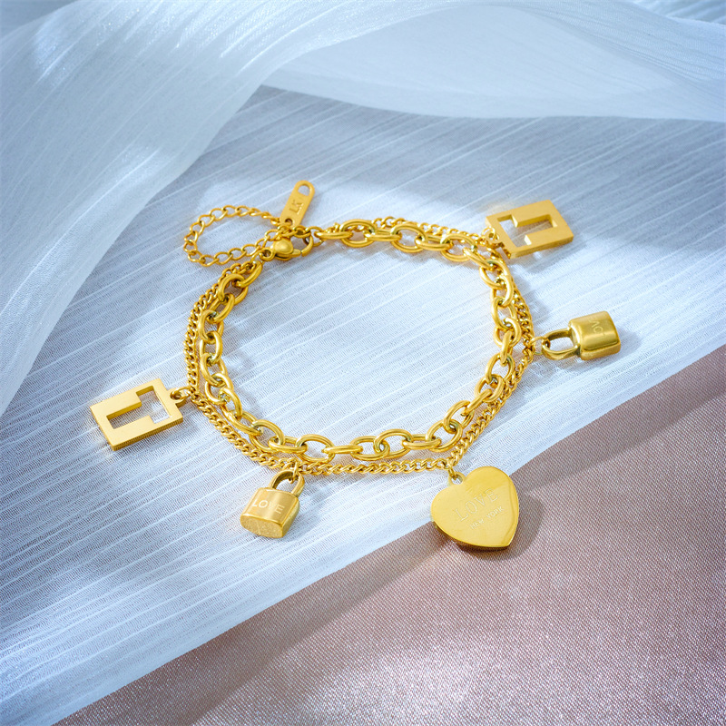 Titanium steel double-layer chain heart-shaped engraved hollow lock pendant, jewelry bracelet, European and American style