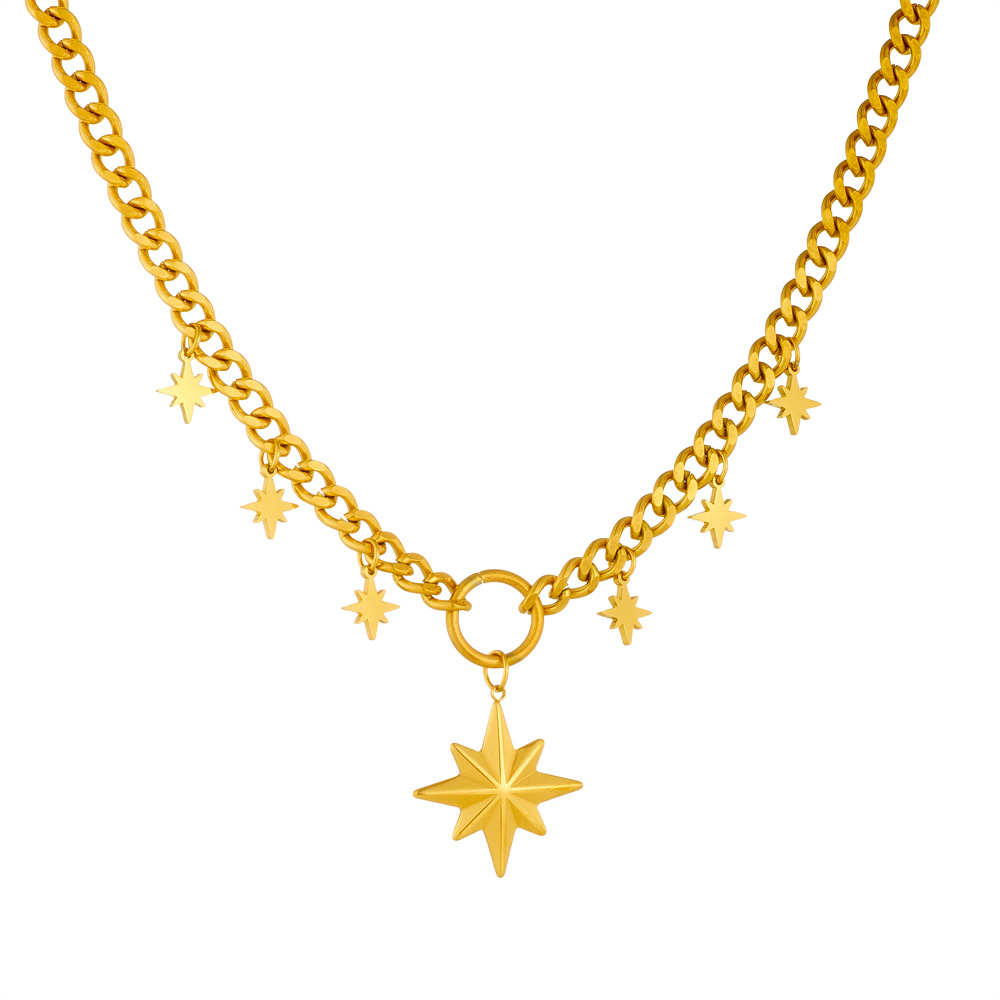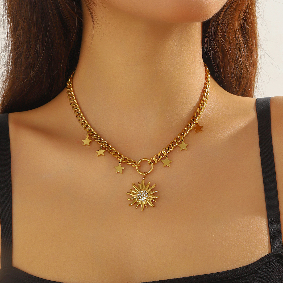 Unisex stainless steel chunky chain necklace with star, diamond-encrusted wings, sun pendant, sweater chain, jewelry wholesale.