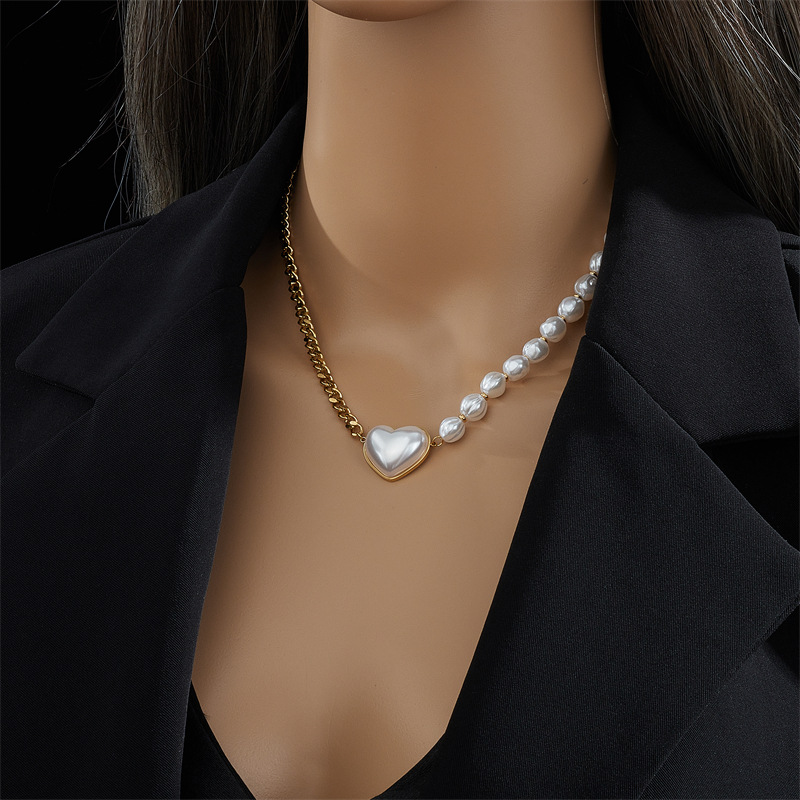 Home > New Arrival > Beaded chain splicing pearl heart pearl titanium steel metal necklace fashion niche punk choker