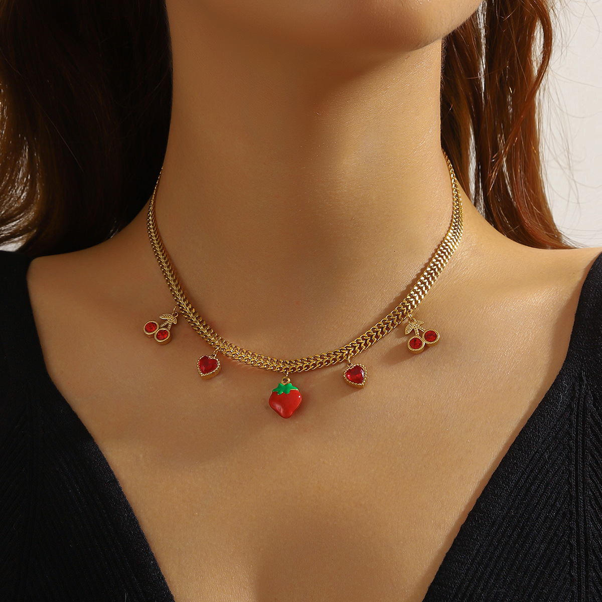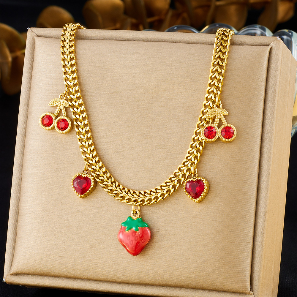Home > New Arrival > Creative fresh fruit series design three-dimensional strawberry and cherry pendant chain stainless steel necklace