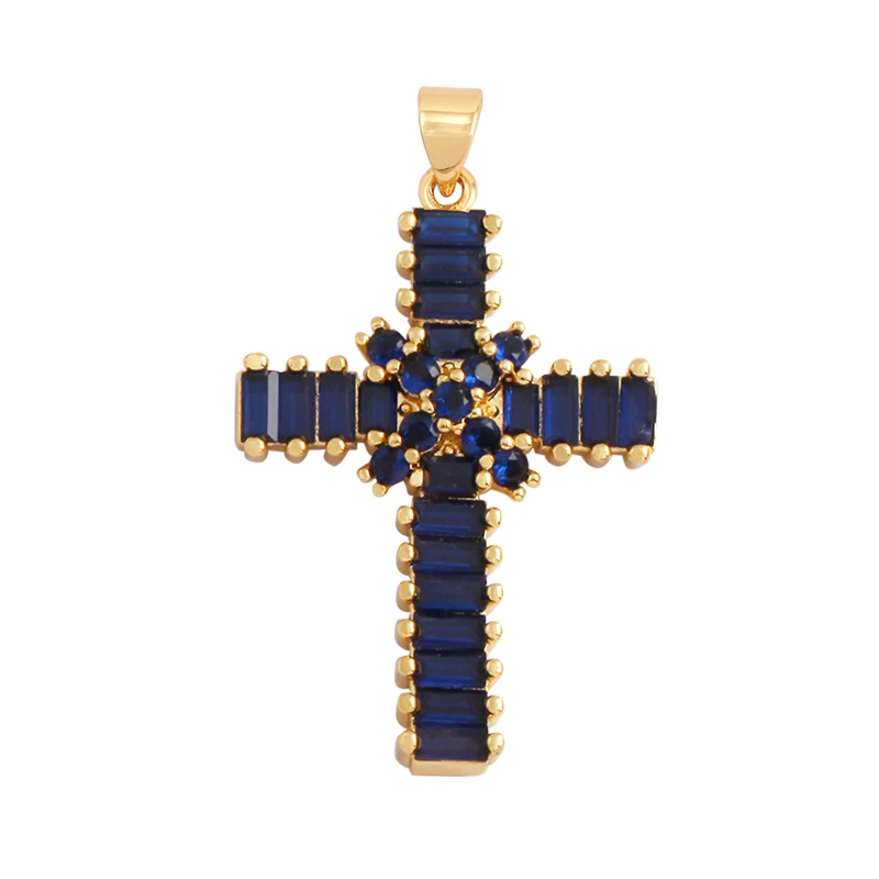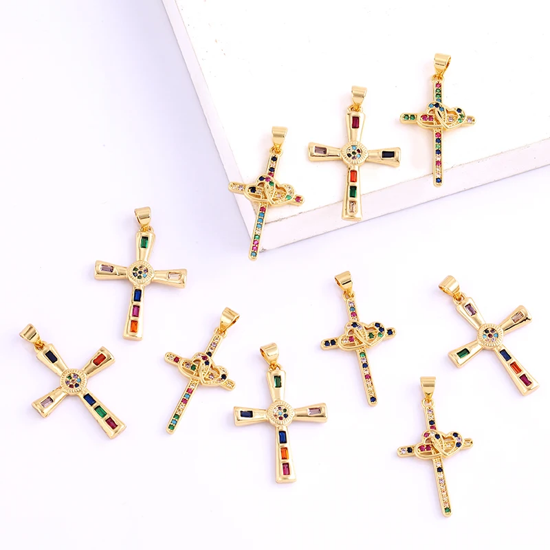 Cross Religious Style Charm Pendant,Gold Plated Inlaid Colorful Cubic Zirconia Jewelry Necklace Bracelet Accessories Supply M51