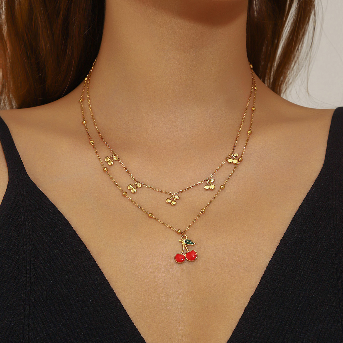 Cute cherry pendant, double-layered stainless steel chain necklace, everyday versatile decoration for women.