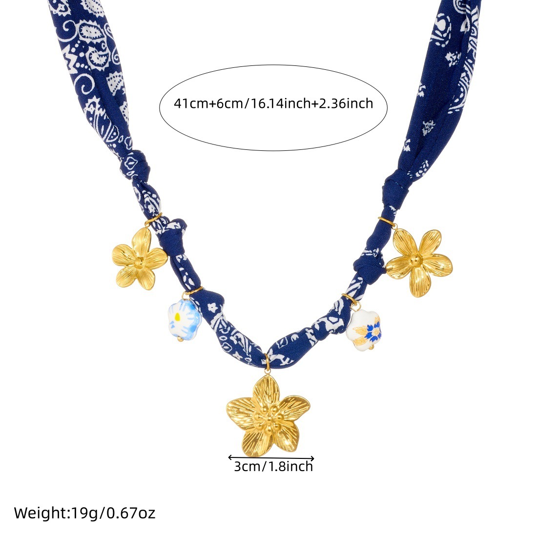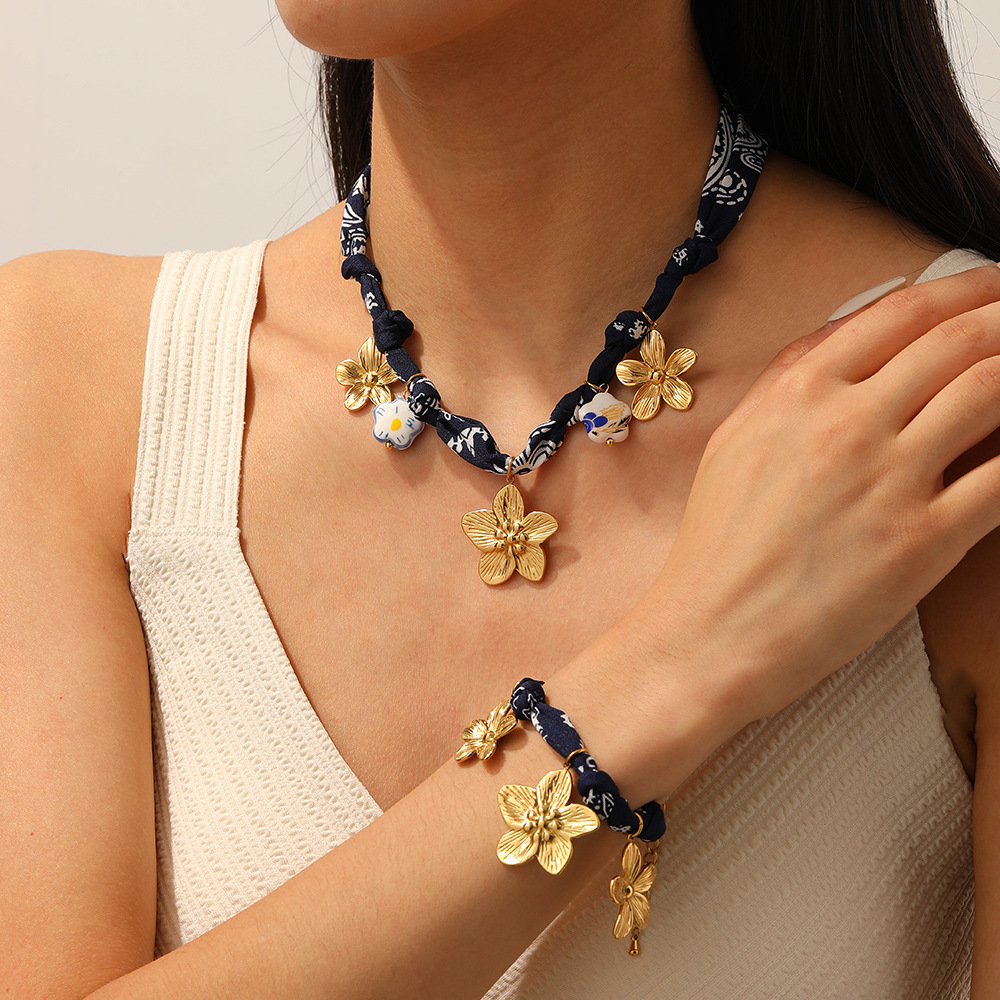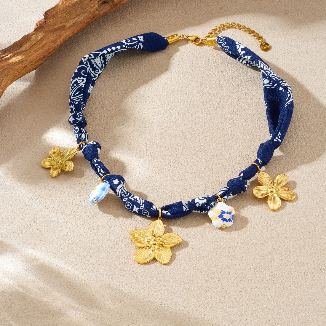 Elegant retro blue printed fabric ribbon chain ceramic painted flower gold-plated pendant jewelry set