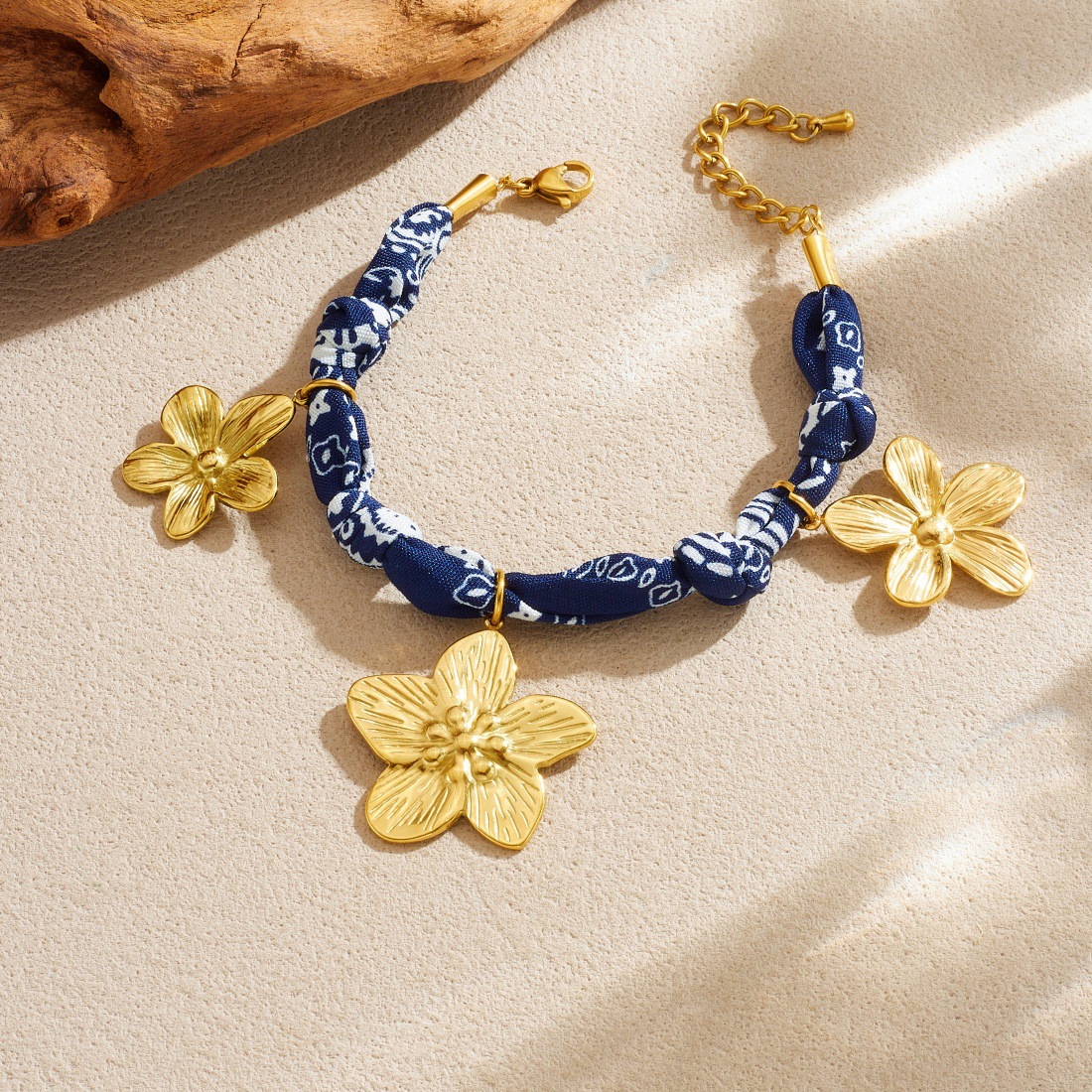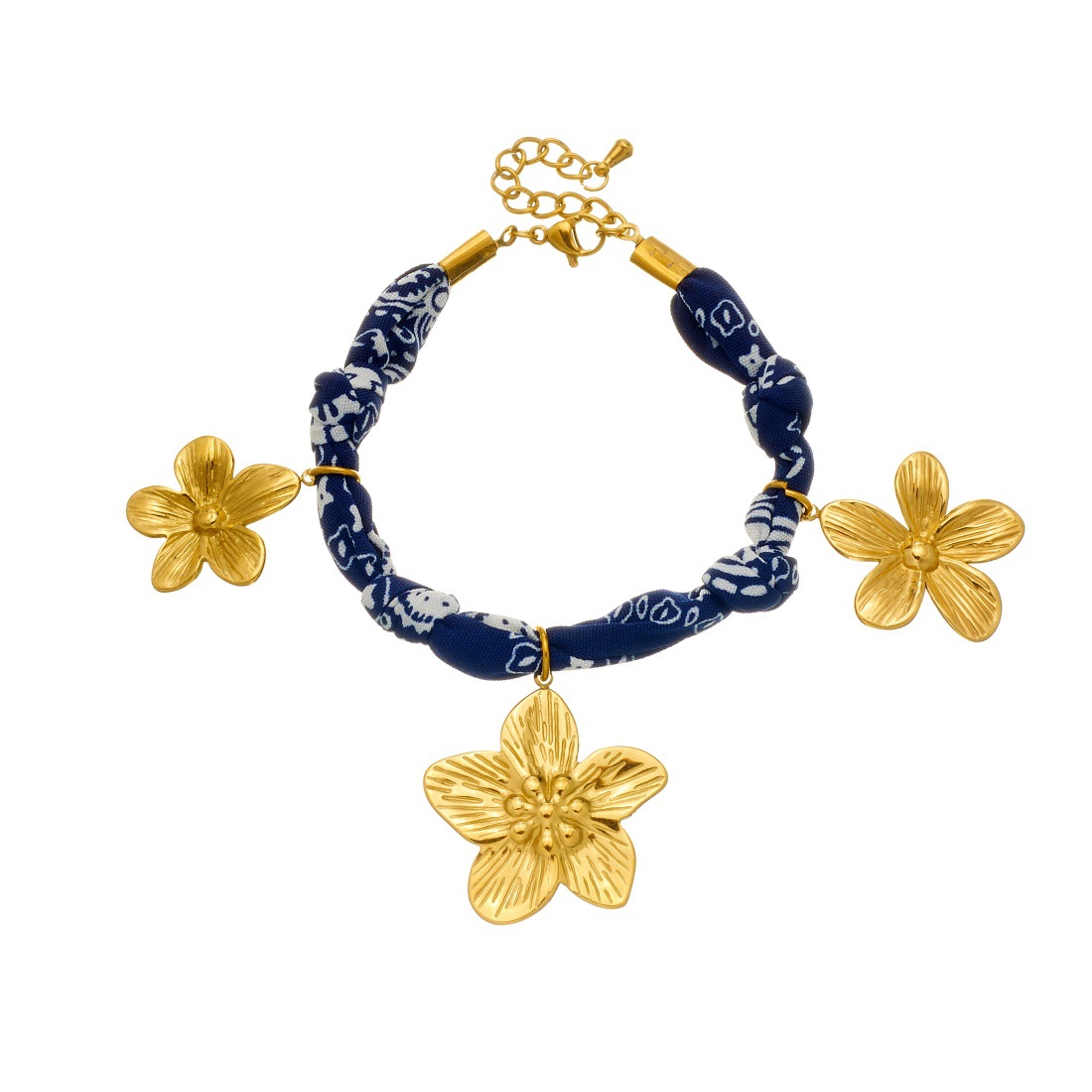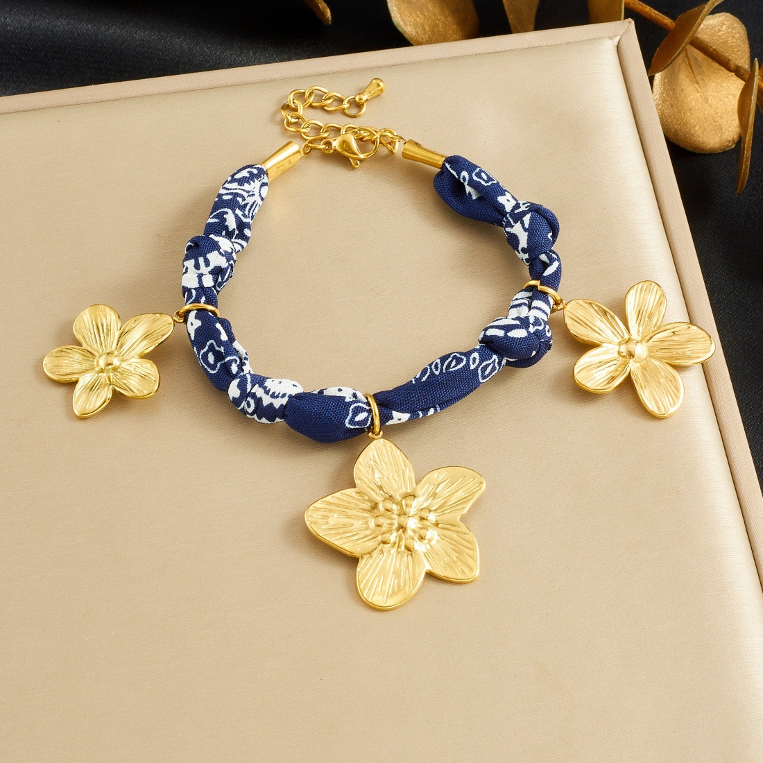 Elegant retro blue printed fabric ribbon chain ceramic painted flower gold-plated pendant jewelry set