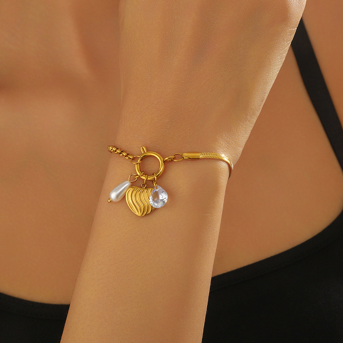 Fashion, elegant and versatile gold-plated heart-shaped square white shell pearl teardrop pendant irregular stainless steel bracelet