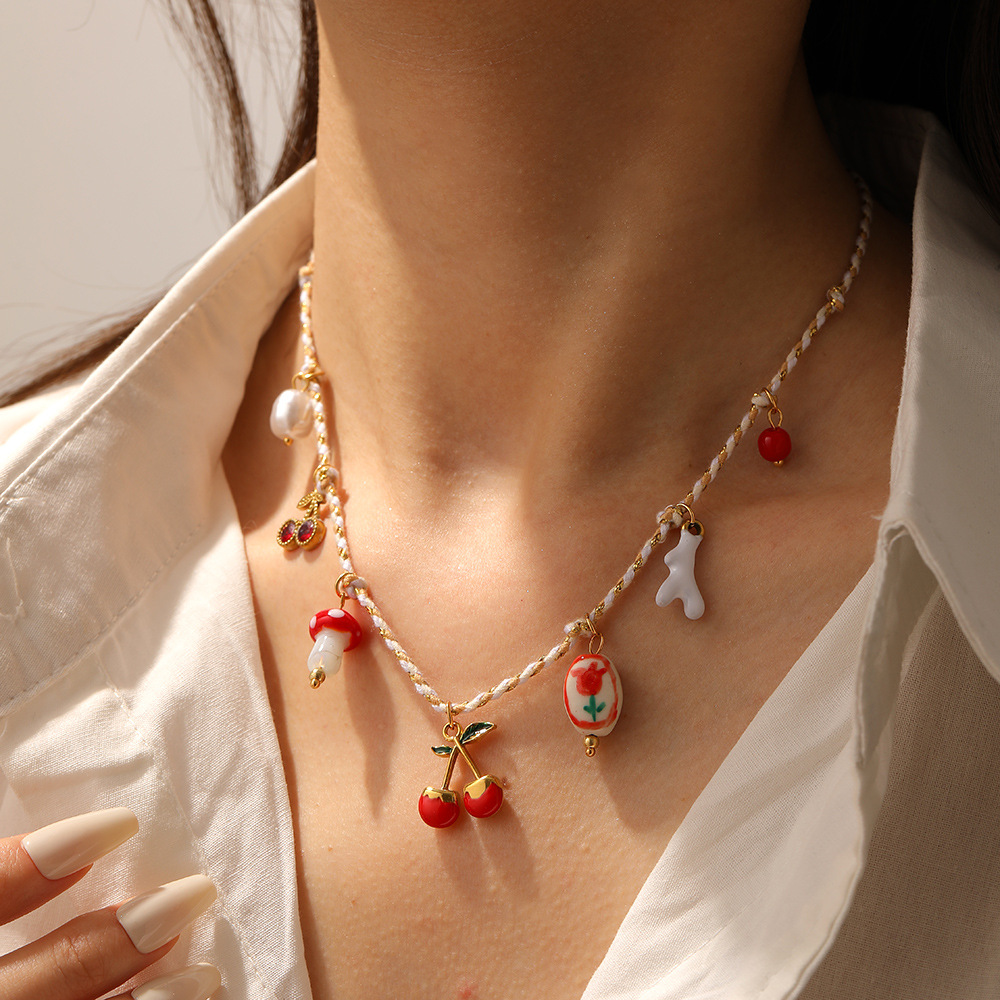Home > New Arrival > Fashion, fresh and sweet, multi-element gold-plated, oil-sprinkled, cherry blossom painted ceramic flower pendant, pastoral style necklace