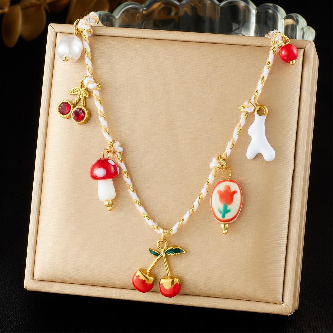 Fashion, fresh and sweet, multi-element gold-plated, oil-sprinkled, cherry blossom painted ceramic flower pendant, pastoral style necklace