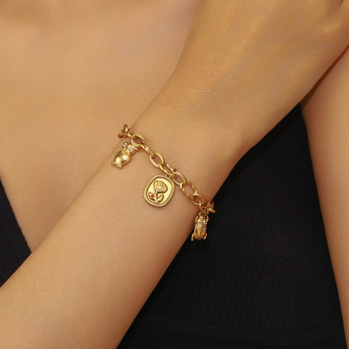 Home > New Arrival > Fashion 18K gold plated stainless steel O-chain animal owl bee ladybug rose pendant bracelet