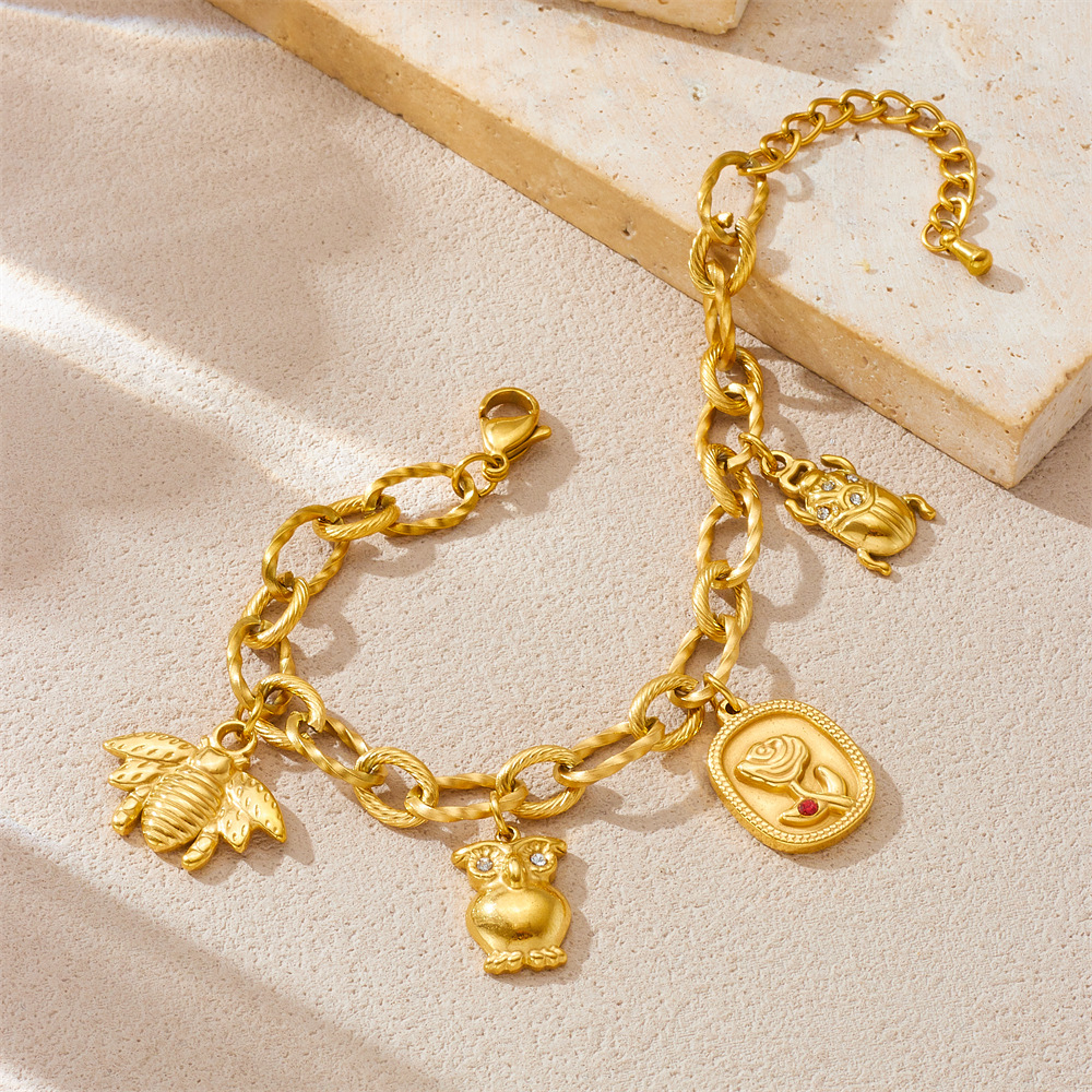 Fashion 18K gold plated stainless steel O-chain animal owl bee ladybug rose pendant bracelet