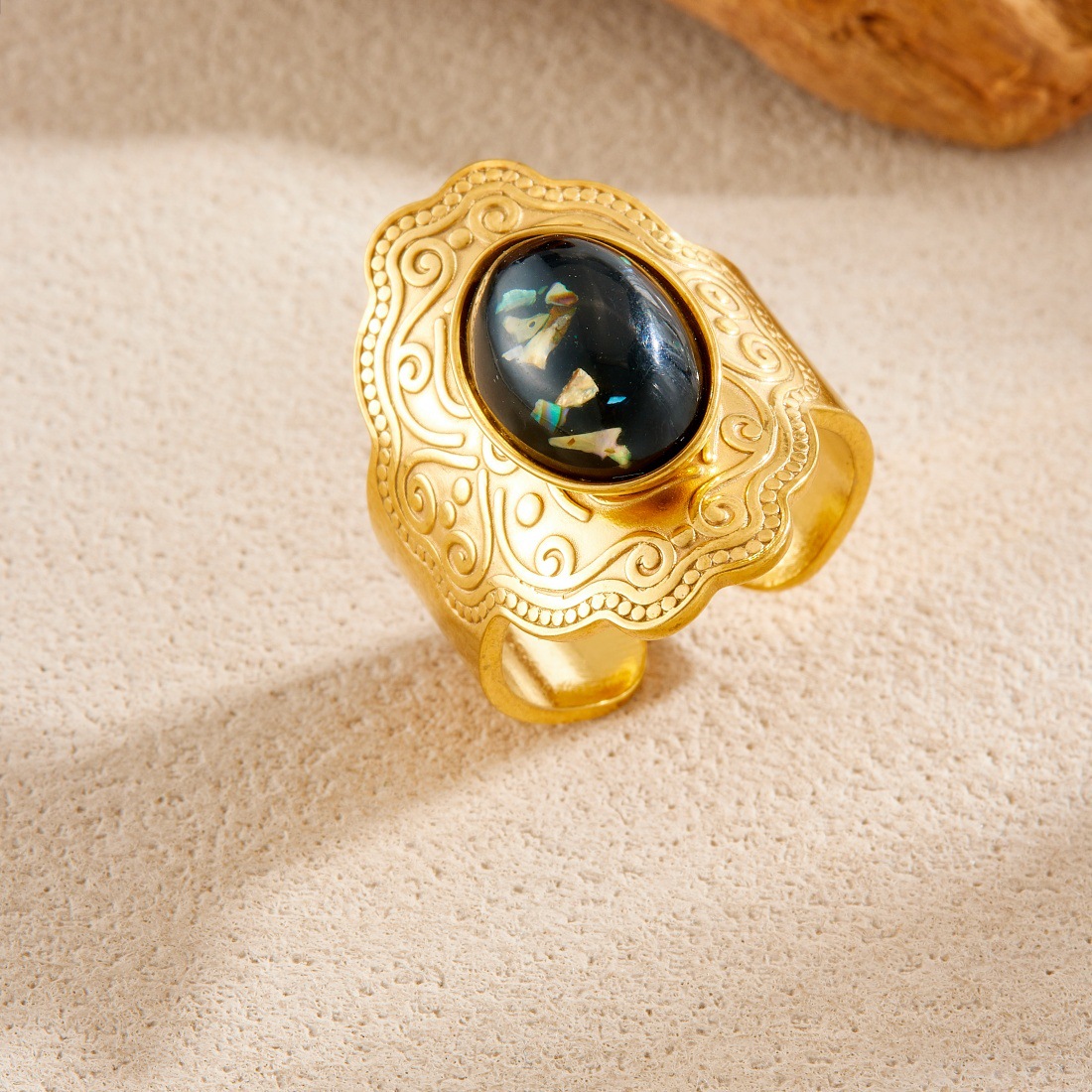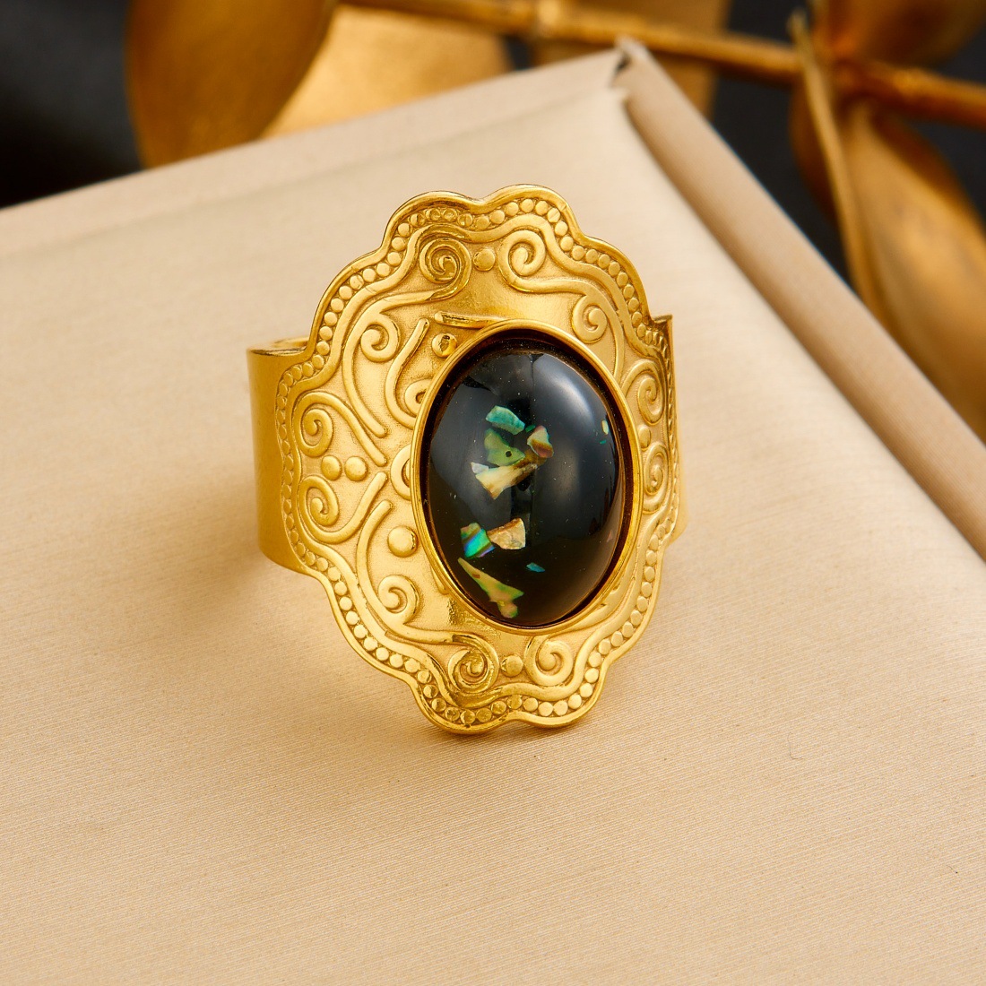 Home > New Arrival > Fashion court style oval gold-plated carved stainless steel ring/band inlaid with pearls, lapis lazuli gemstones