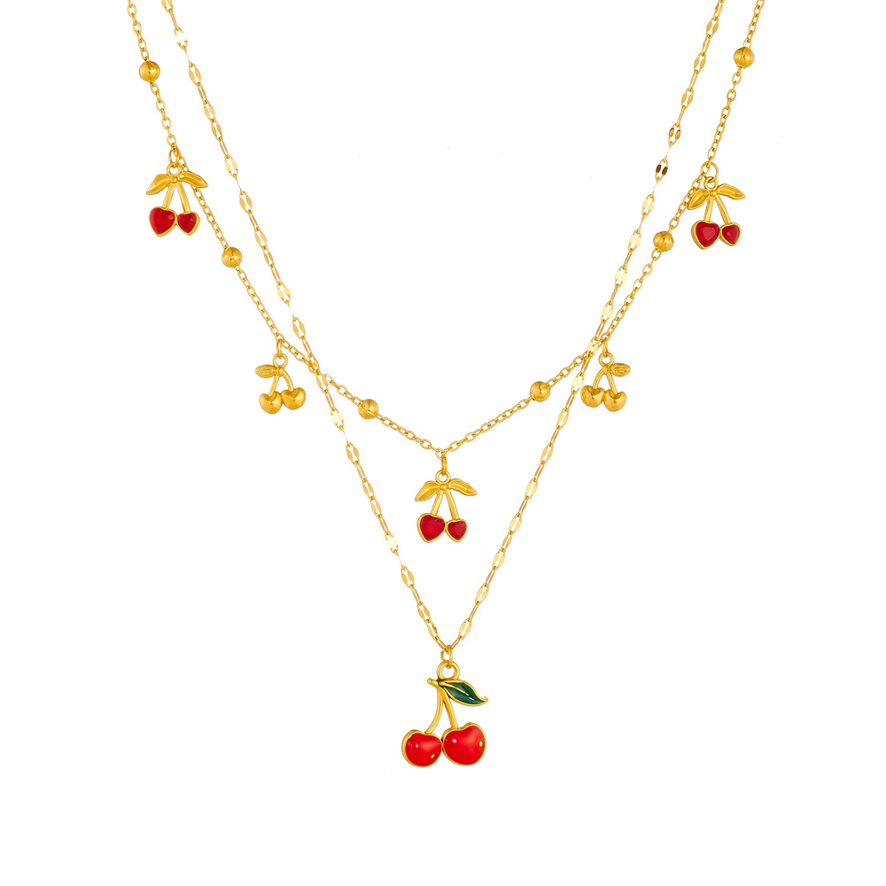 Fashion diamond-encrusted cherry fruit pendant, large and small, stackable chain, stainless steel gold-plated jewelry necklace