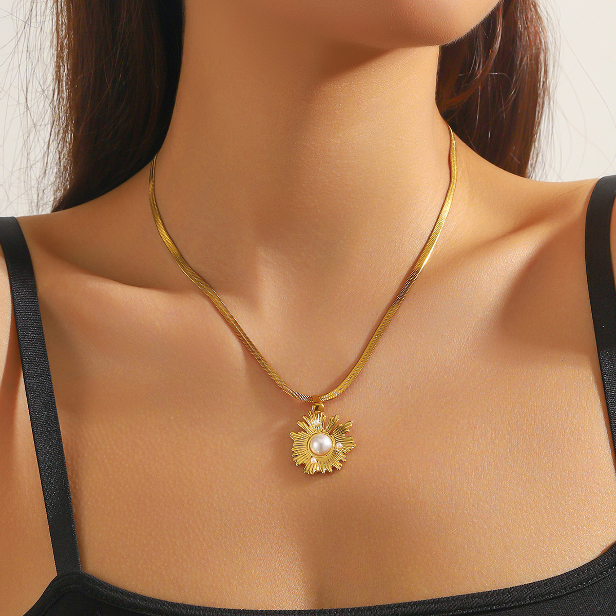 Fashion freshwater pearl sunflower gold-plated blade chain stainless steel pendant irregular personalized necklace