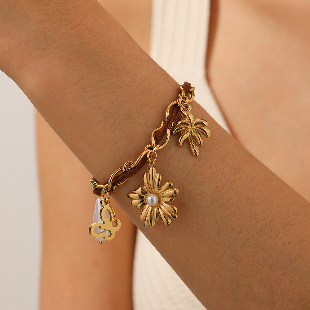 Home > New Arrival > Fashion gold-plated hollow butterfly pearl flower coconut tree pendant brown velvet rope chain stainless steel bracelet