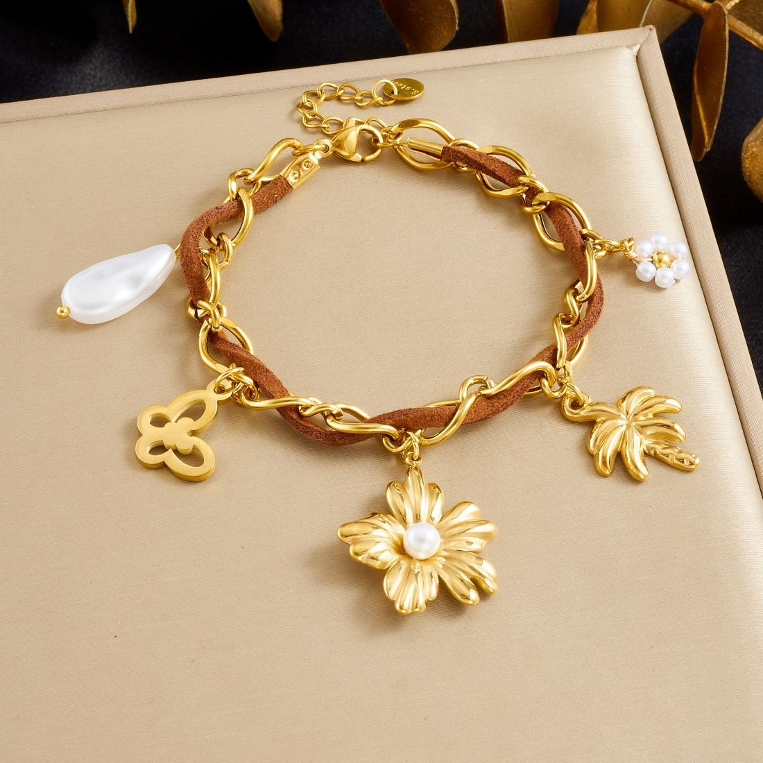 Fashion gold-plated hollow butterfly pearl flower coconut tree pendant brown velvet rope chain stainless steel bracelet