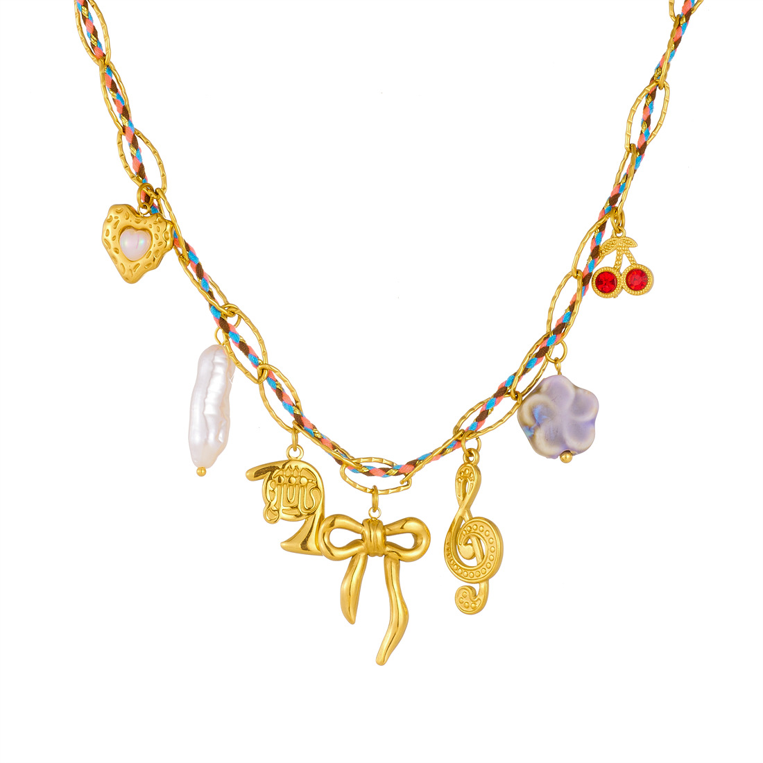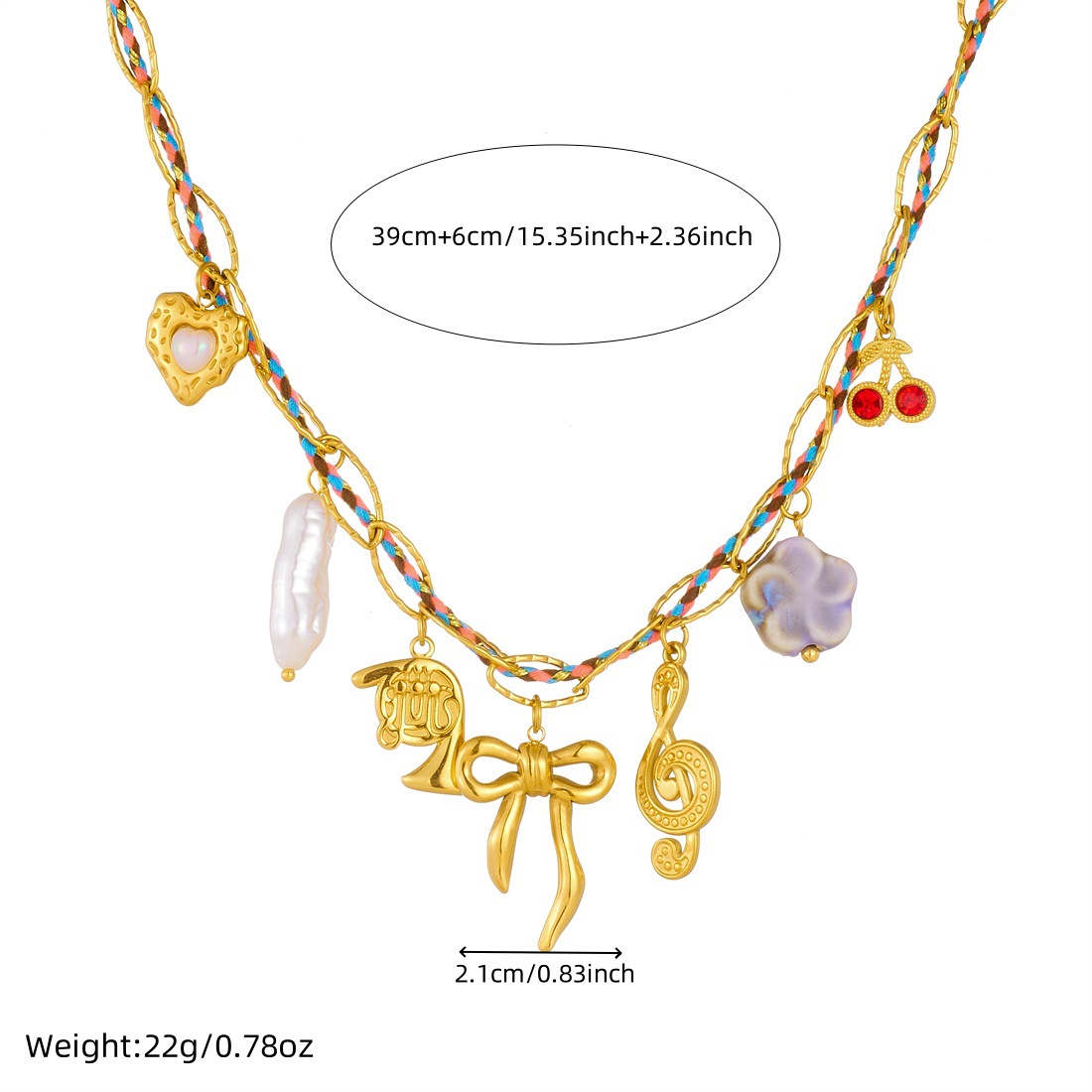 Fashion gold-plated musical note bow heart pendant chain colorful woven rope stainless steel metal necklace