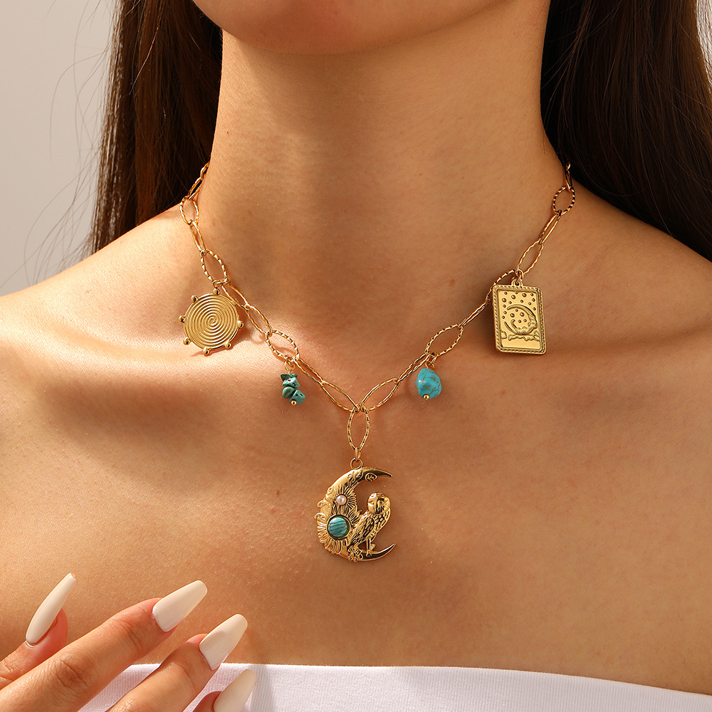 Fashion gold-plated vintage turquoise inlaid pendant square moon-shaped owl pendant clavicle chain necklace