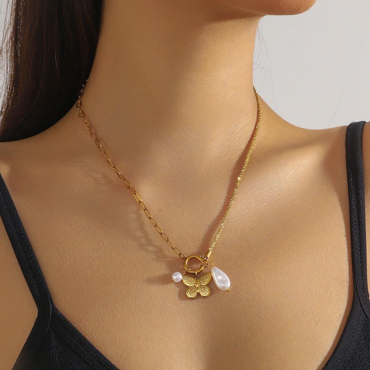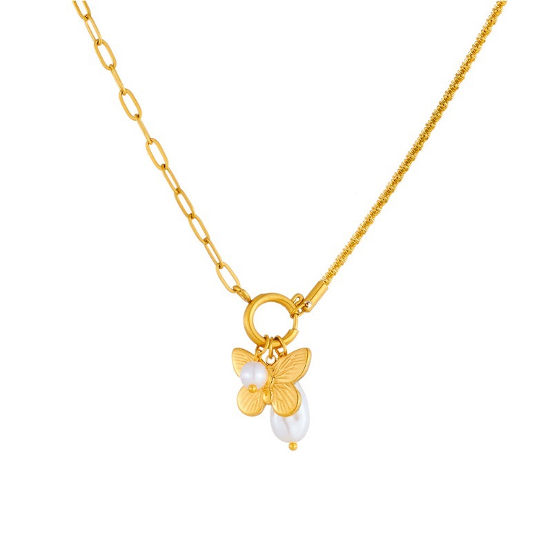 Home > New Arrival > Fashion minimalist creative pearl teardrop butterfly pendant stainless steel asymmetrical chain women's necklace
