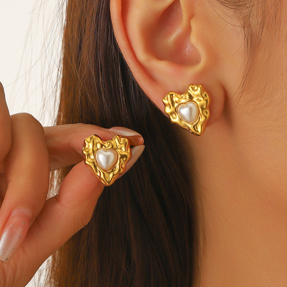 Home > New Arrival > Fashion niche design, irregularly shaped, pearl-inlaid heart-shaped stainless steel French earrings
