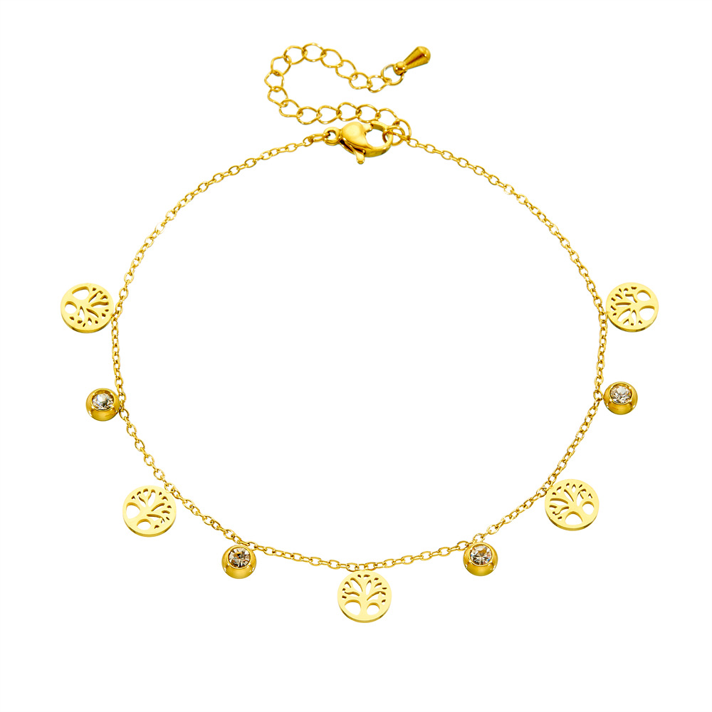 Fashion niche design diamond-encrusted hollowed-out round tree of life cross pendant chain stainless steel anklet
