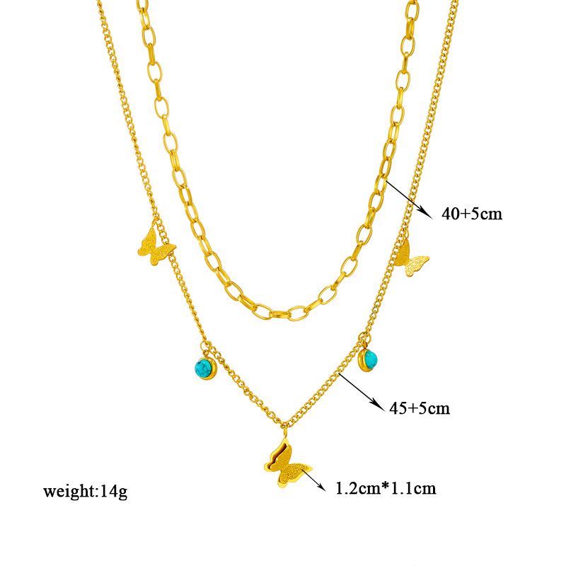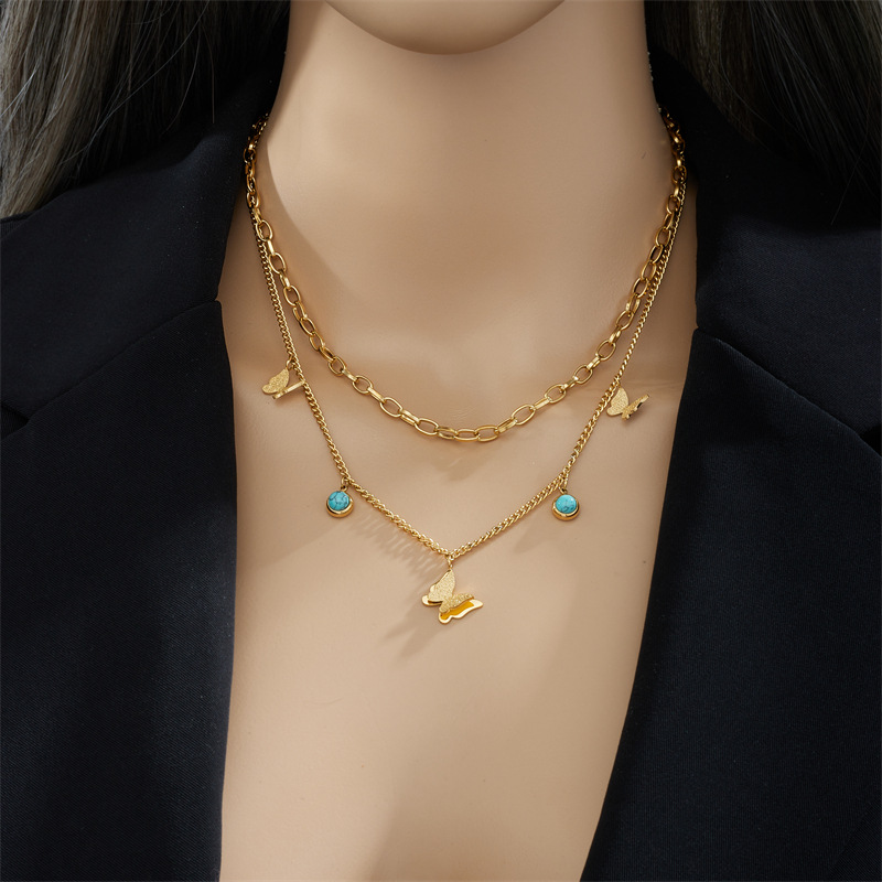 Home > New Arrival > Fashion niche double-layered blue turquoise pendant three-dimensional butterfly titanium steel jewelry necklace