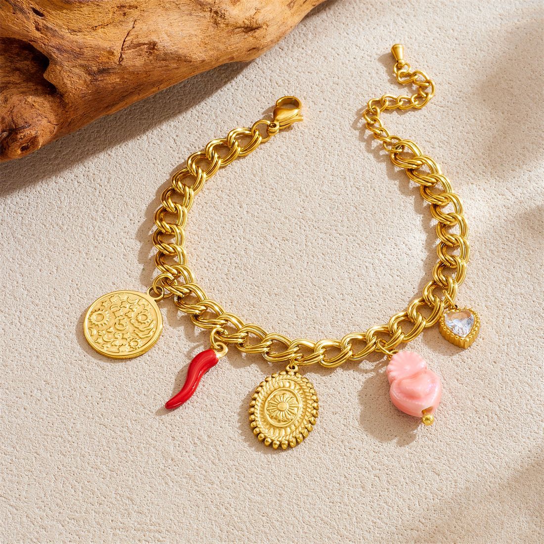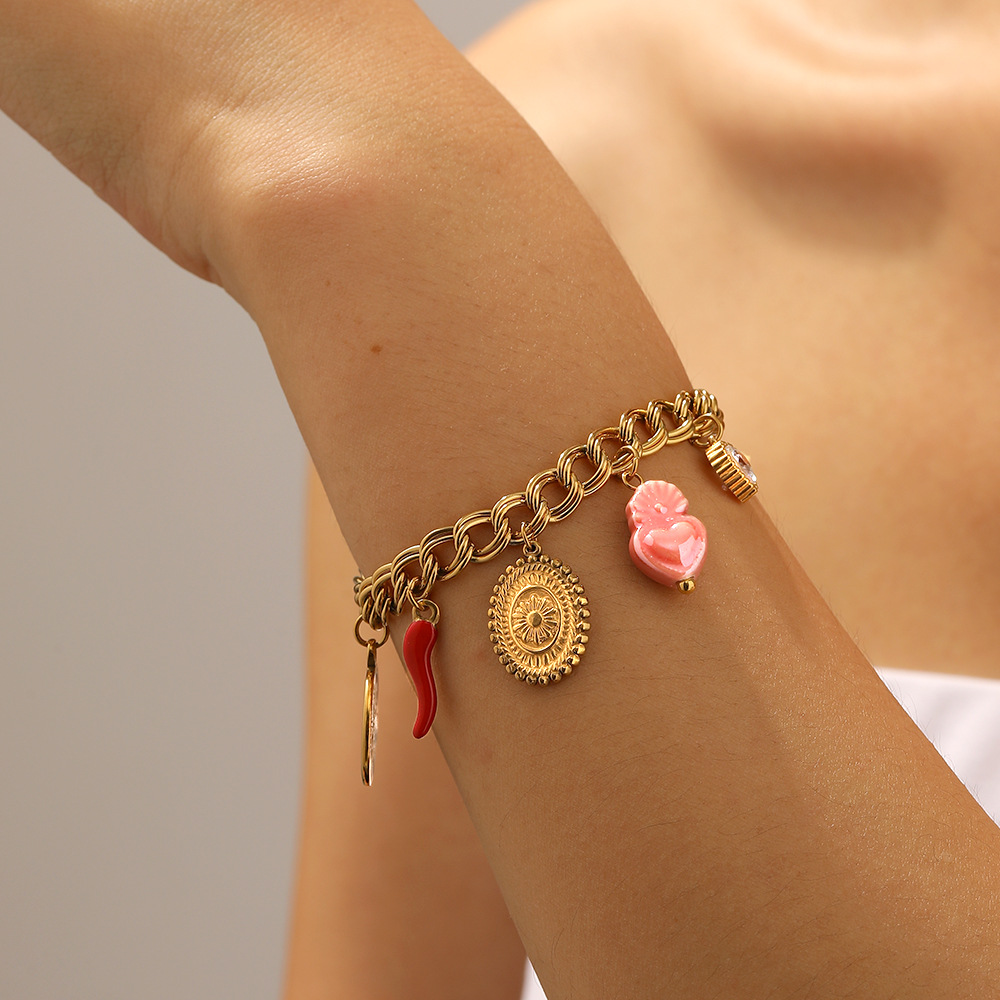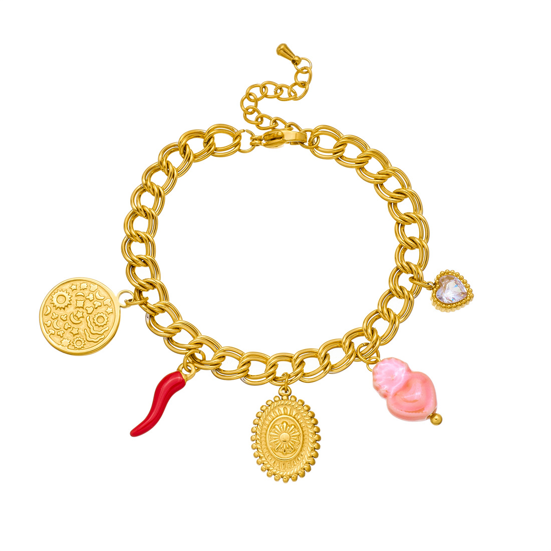 Home > New Arrival > Fashion personalized retro round plaque embossed pattern gold-plated pendant stainless steel heart chili pepper bracelet