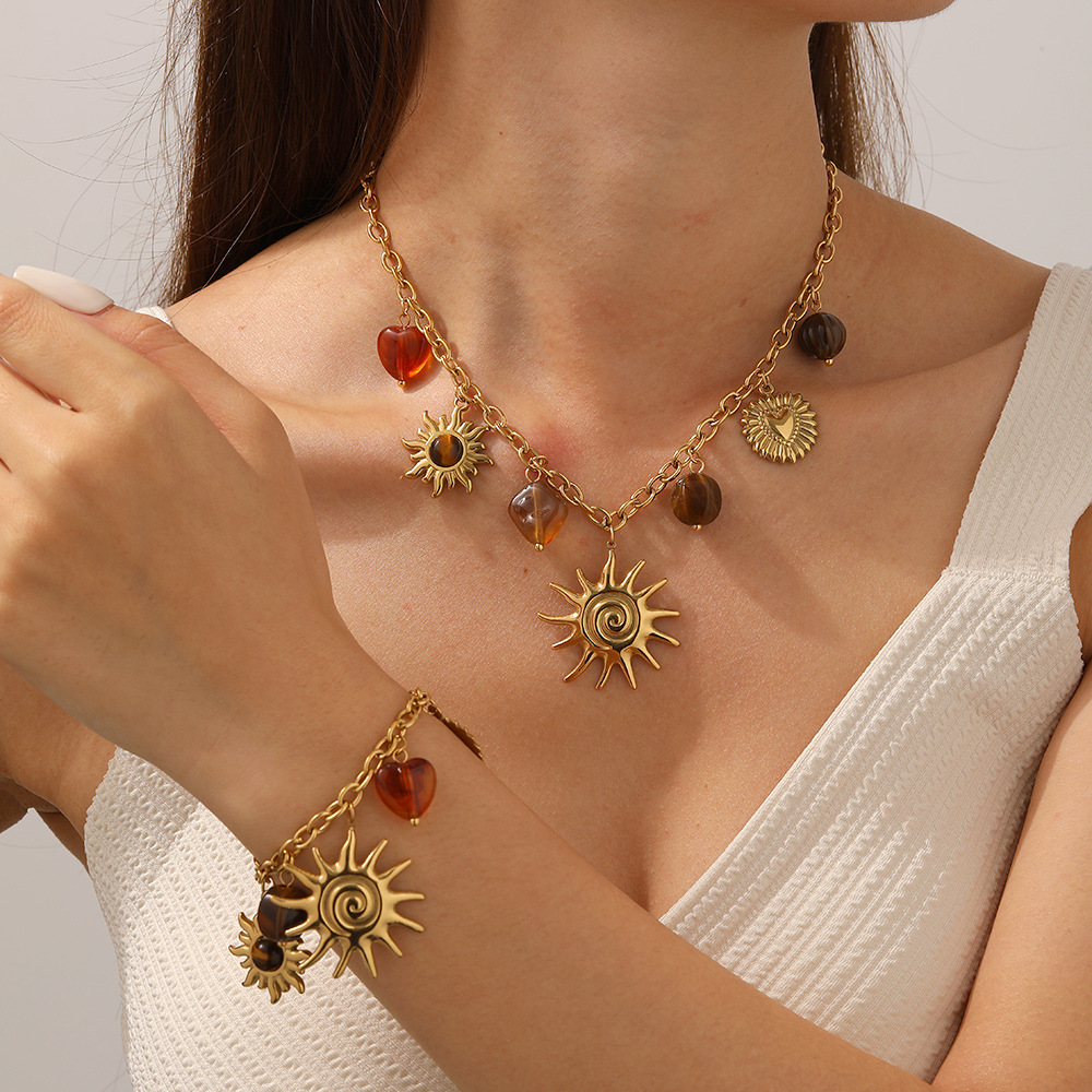 Home > New Arrival > Fashion retro gold-plated simulated tiger's eye stone accessories round plaque relief heart pendant necklace