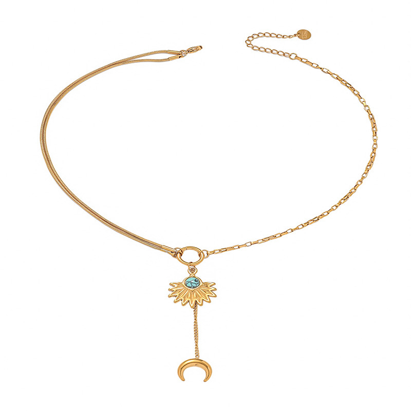 Fashion retro long tassel moon pendant stainless steel fan-shaped turquoise accessory chain necklace for women