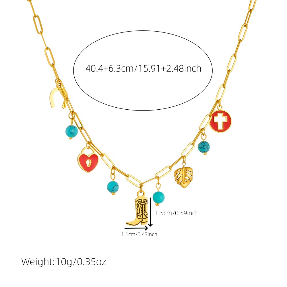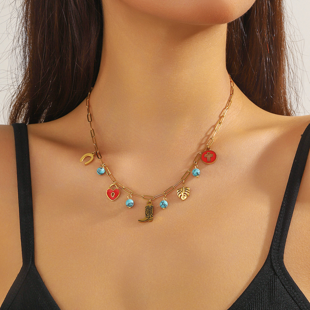 Home > New Arrival > Fashion retro red dripping round hollow cross heart lock leaf boot pendant chain necklace