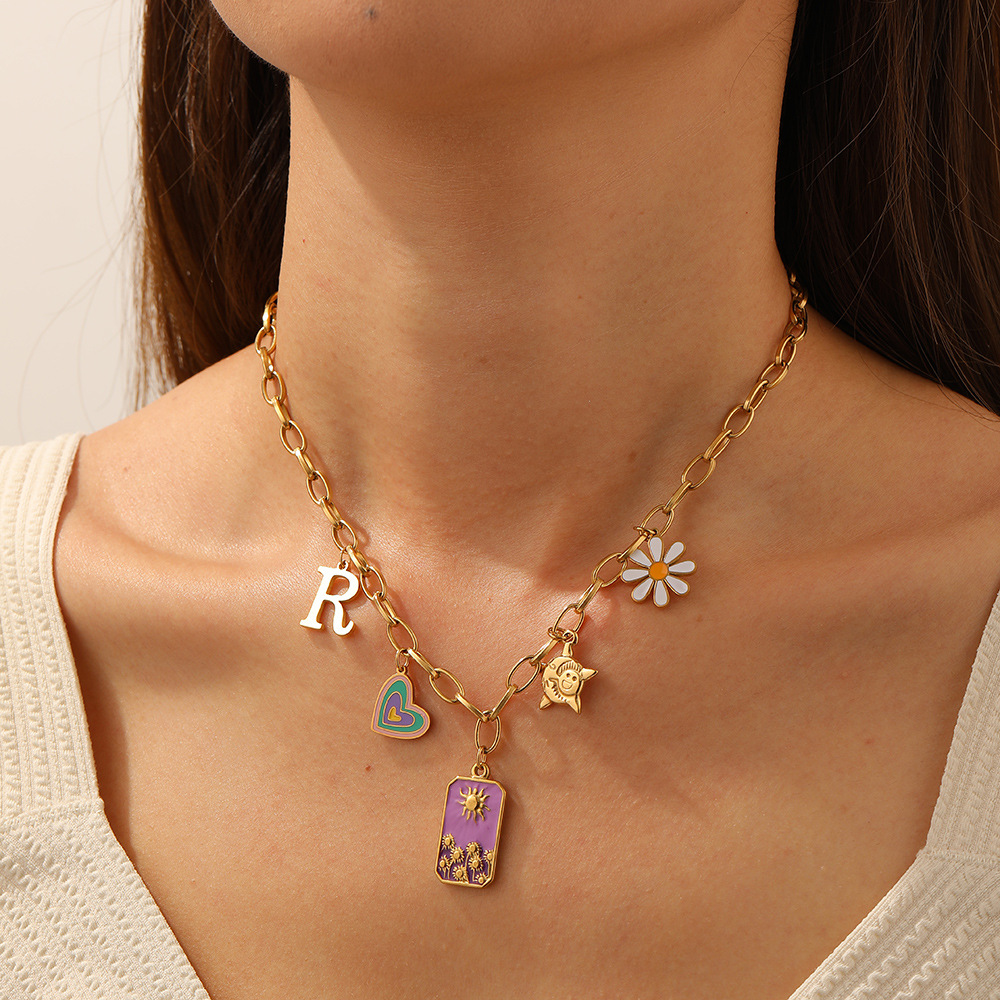 Fashion trendy drip-colored heart square sun daisy flower pendant stainless steel necklace