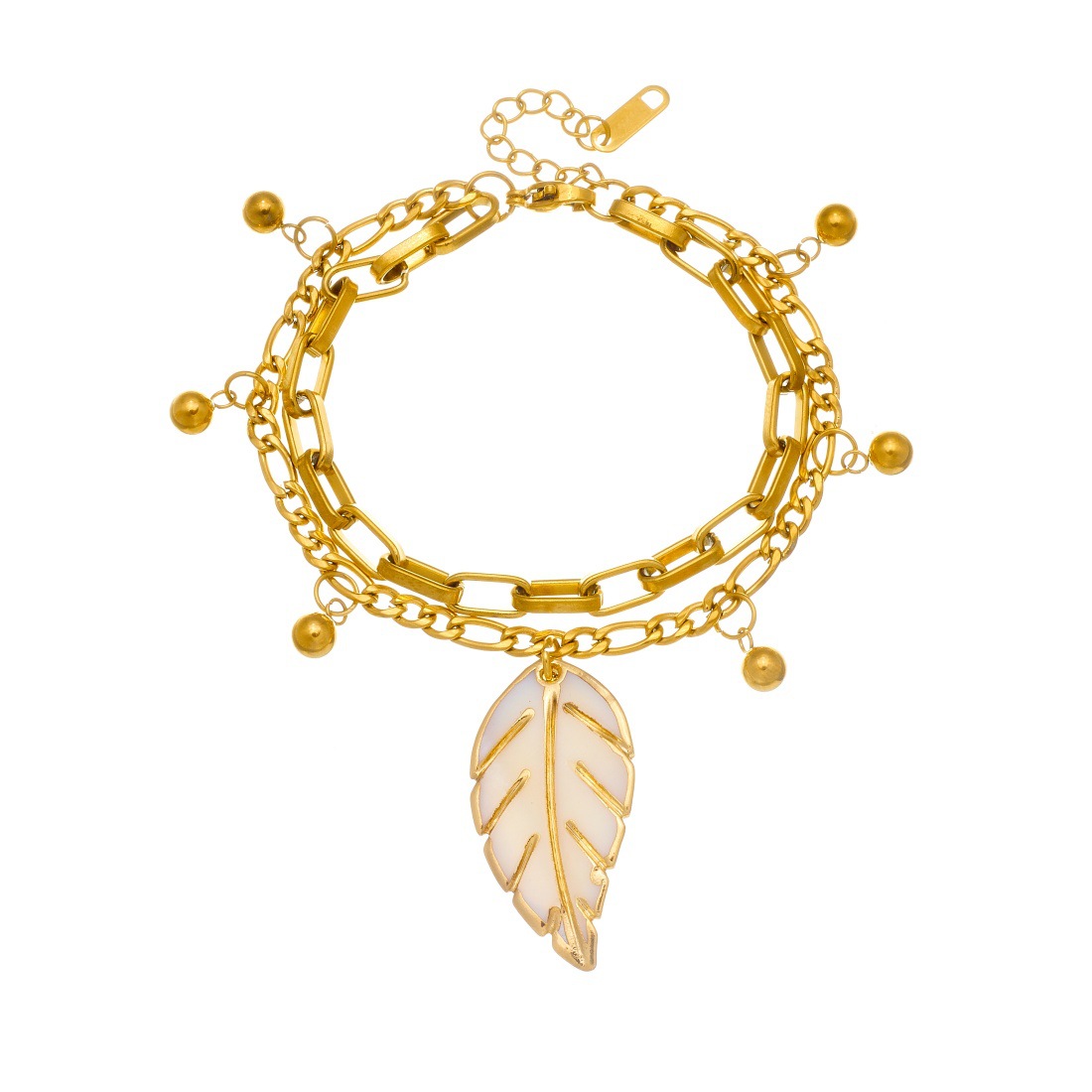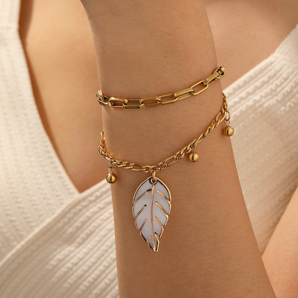 Home > New Arrival > Fashion vintage layered metal double-layer stainless steel chain gold bead drip oil leaf pendant accessory bracelet