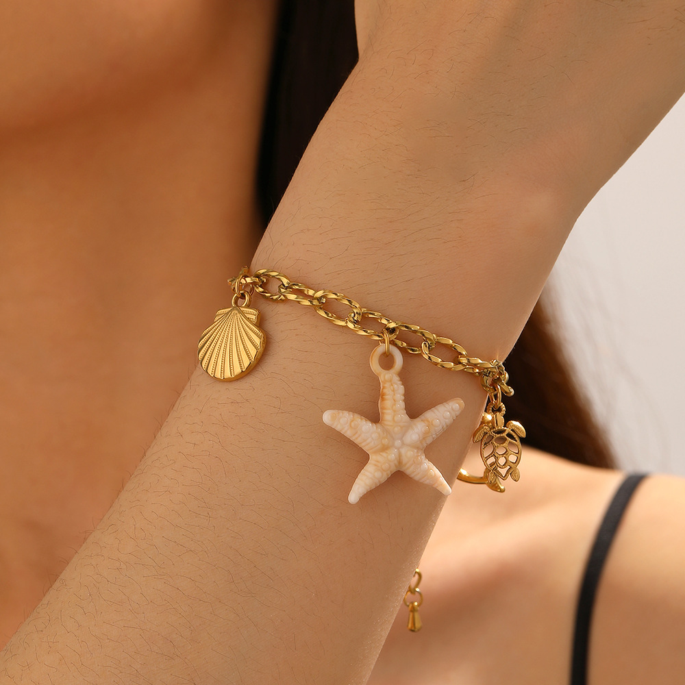 Home > New Arrival > Fashionable, creative, and unique ocean-themed series of starfish, scallop, turtle, and dolphin pendants with chunky chains and stainless steel bracelets.