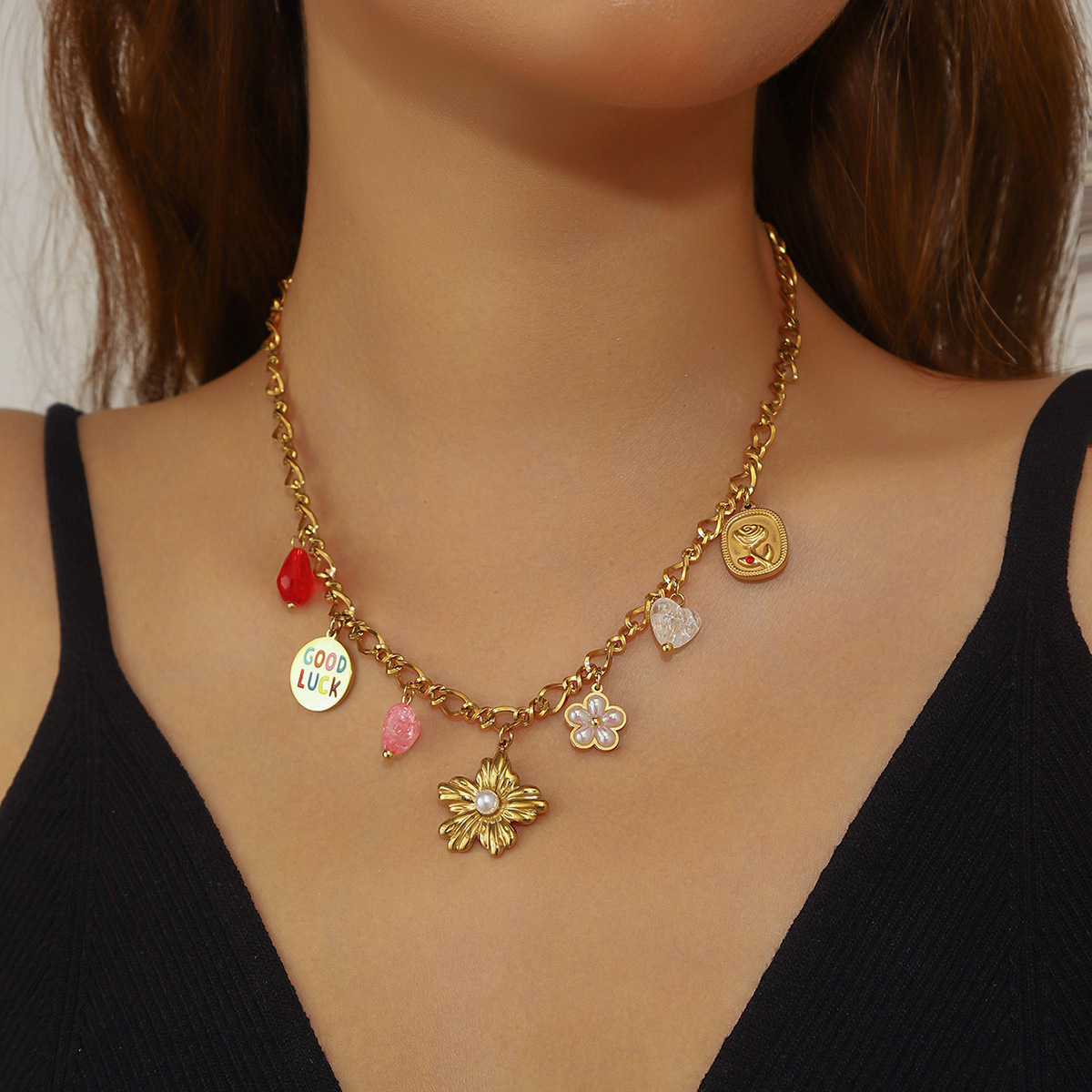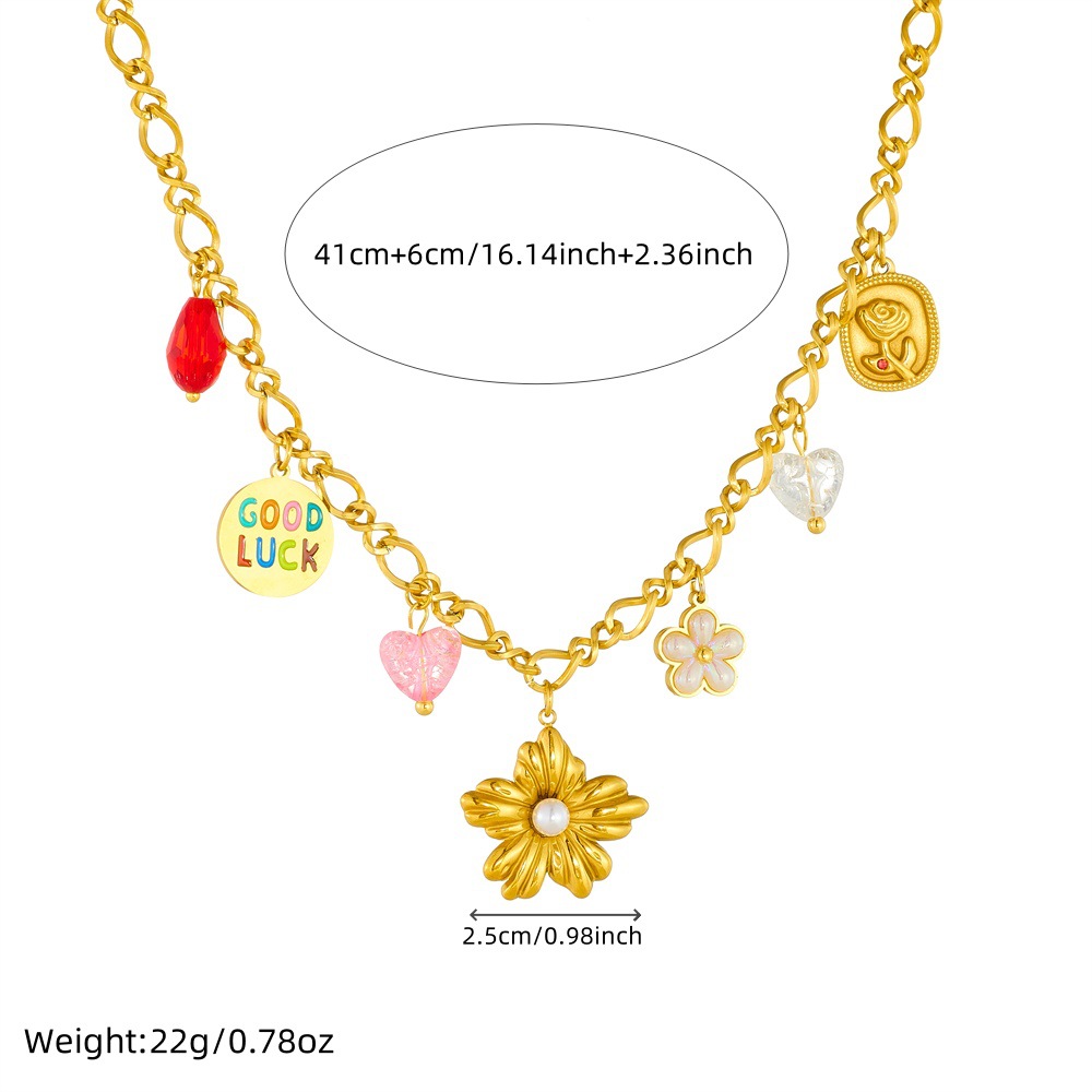 Home > New Arrival > Fashionable, fresh and sweet, multi-element accessories, flower dripping oil, GOODLUCK round pendant stainless steel necklace