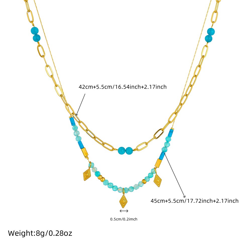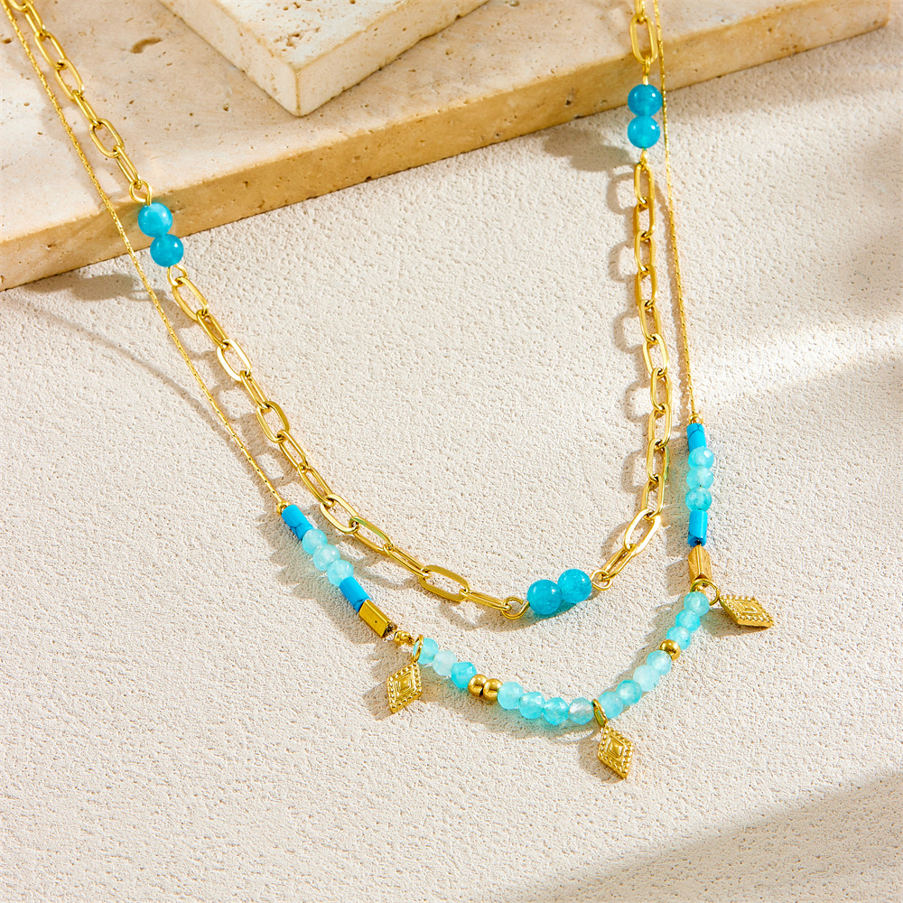 Home > New Arrival > Fashionable, retro South Asian style blue beaded stacked chain diamond-shaped accessories stainless steel O-shaped necklace