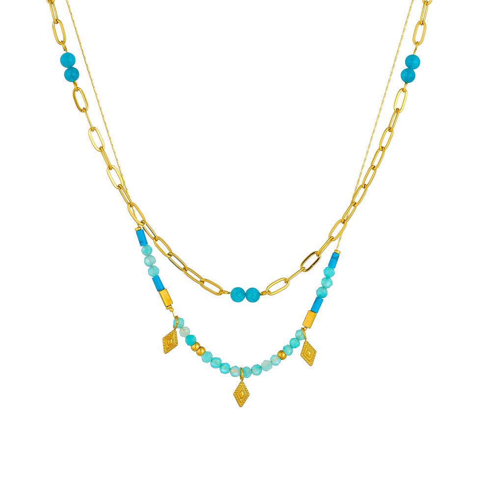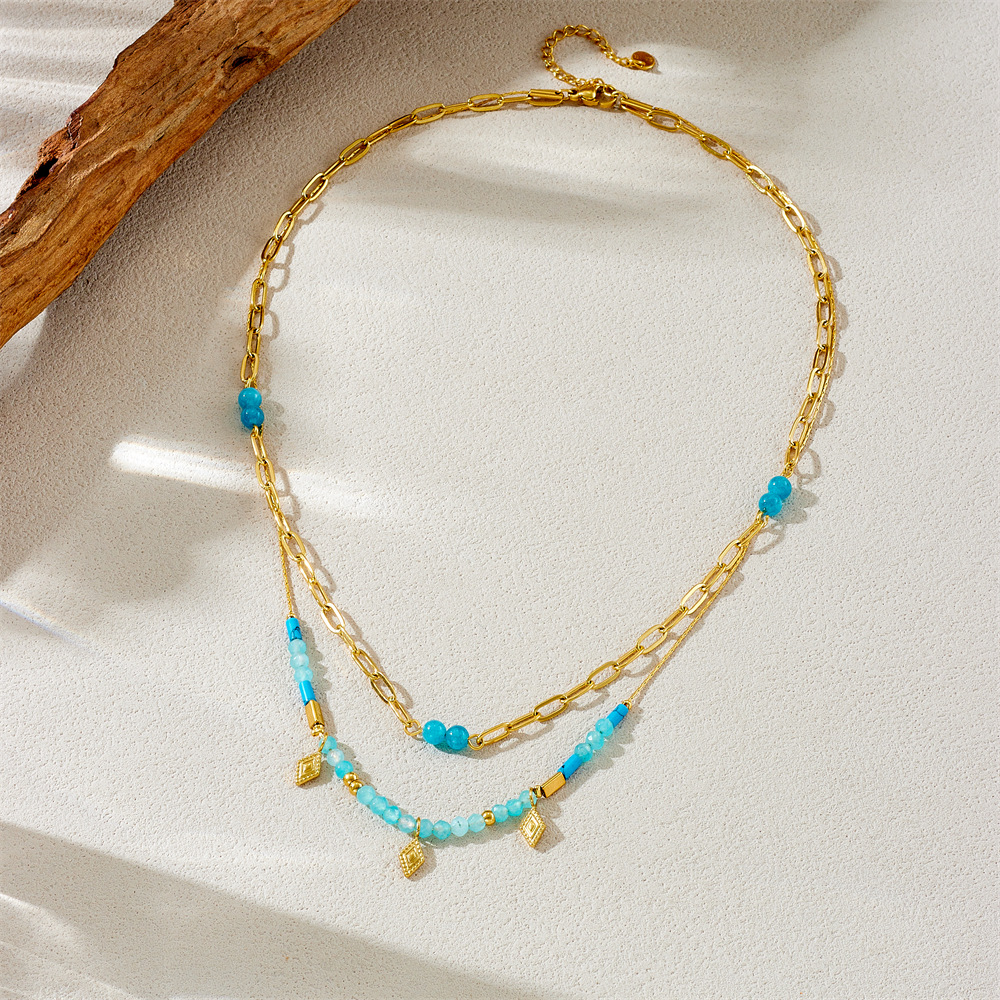 Home > New Arrival > Fashionable, retro South Asian style blue beaded stacked chain diamond-shaped accessories stainless steel O-shaped necklace