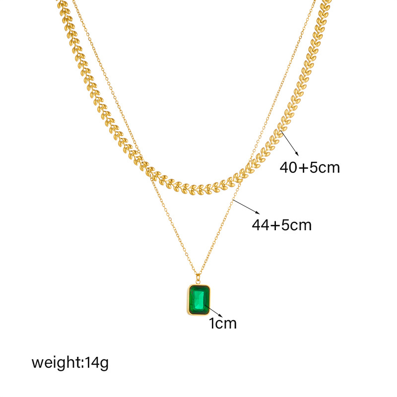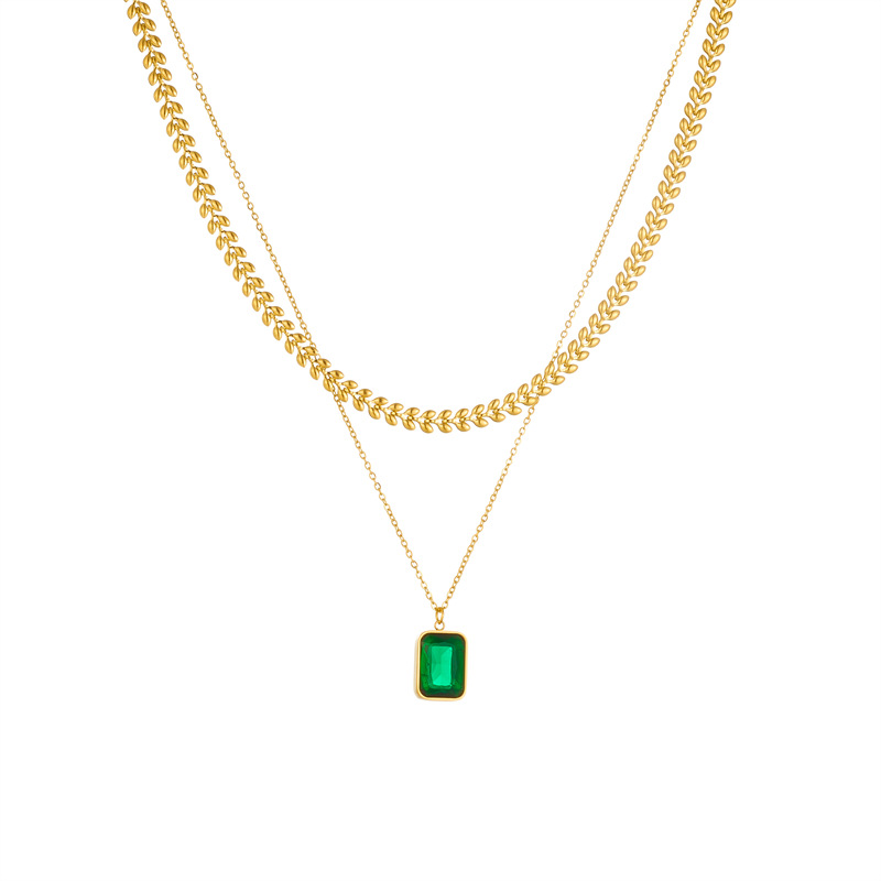 Fashionable, sophisticated, and luxurious emerald square gemstone pendant clavicle chain, titanium steel multi-layered necklace.