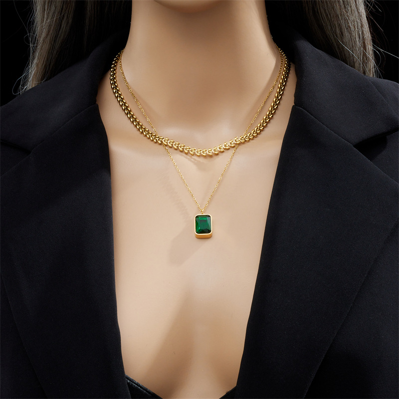 Home > New Arrival > Fashionable, sophisticated, and luxurious emerald square gemstone pendant clavicle chain, titanium steel multi-layered necklace.