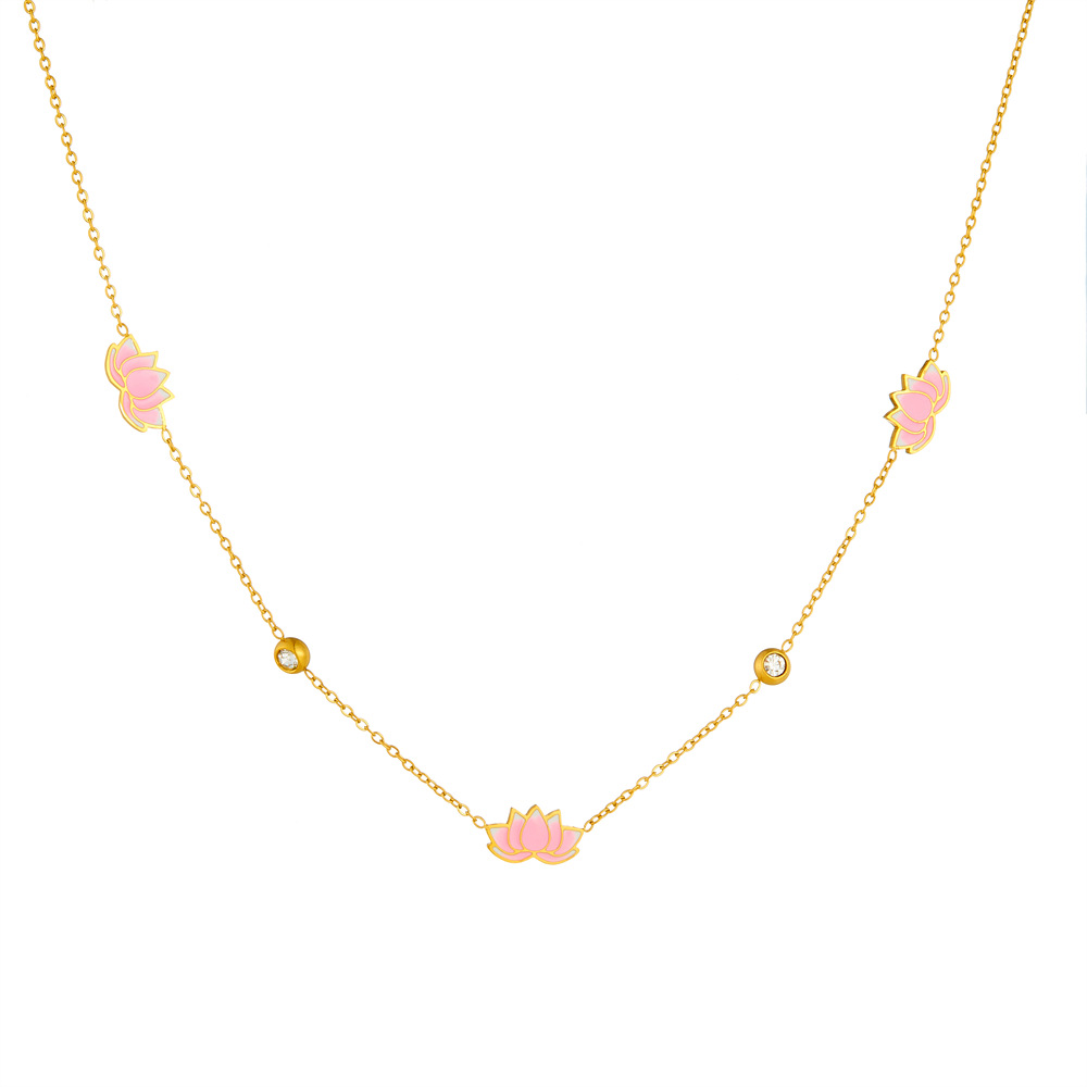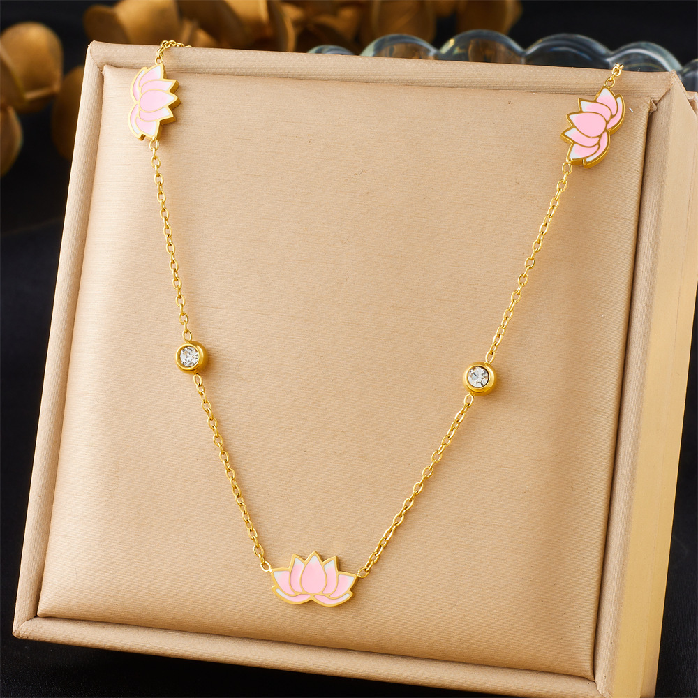 Fashionable and minimalist new Chinese style epoxy resin pink gradient lotus flower rhinestone-encrusted delicate chain necklace, earrings, and bracelet set
