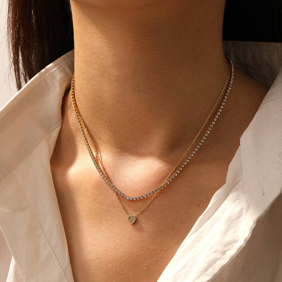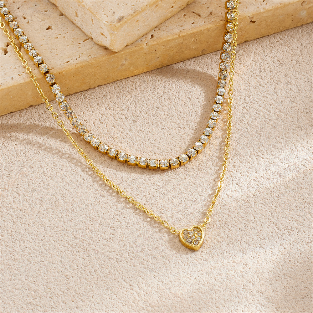 Fashionable and simple round heart-shaped pendant accessory double-layer stainless steel full diamond necklace