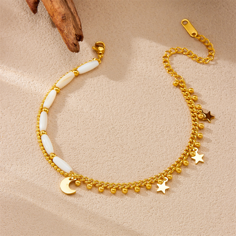 Home > New Arrival > Fashionable and unique double-layer chain beaded gold-plated stainless steel anklet with five-pointed star and moon accessories for women.