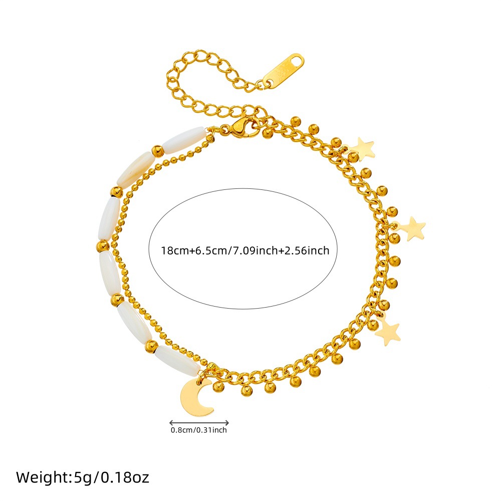 Fashionable and unique double-layer chain beaded gold-plated stainless steel anklet with five-pointed star and moon accessories for women.