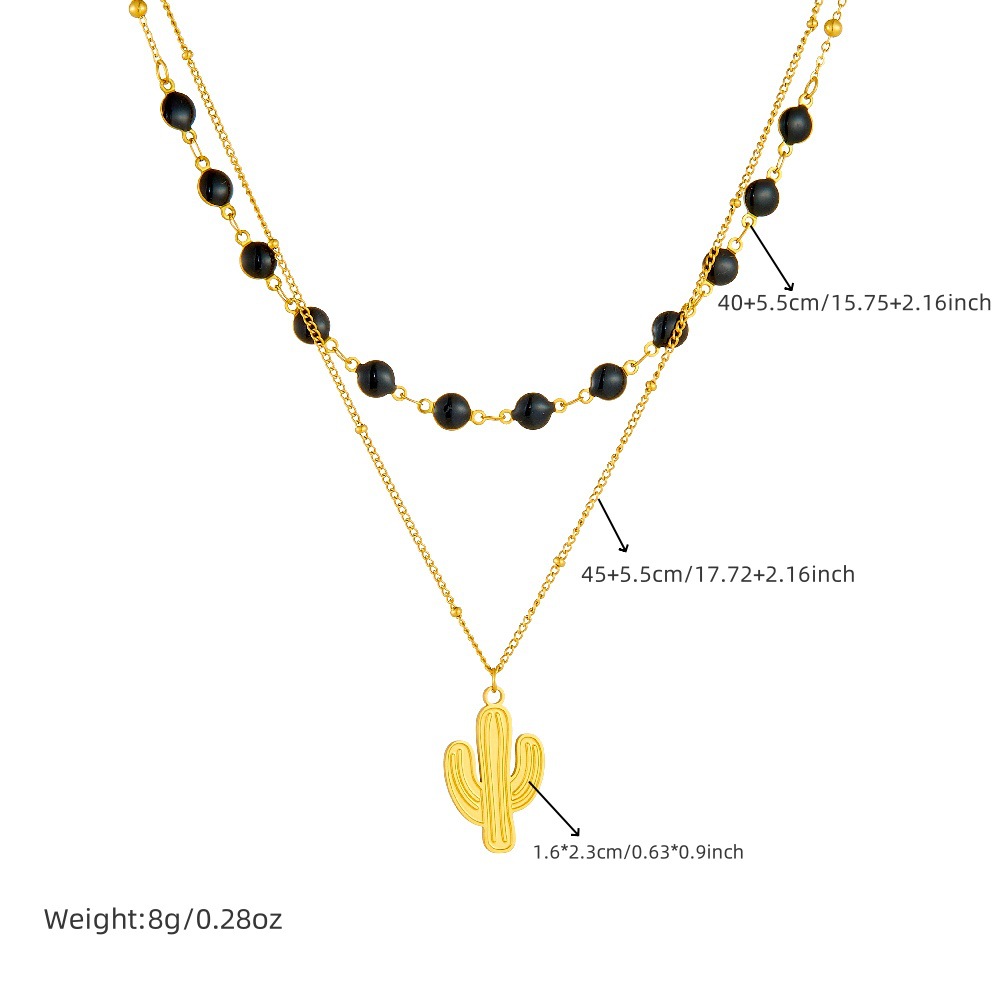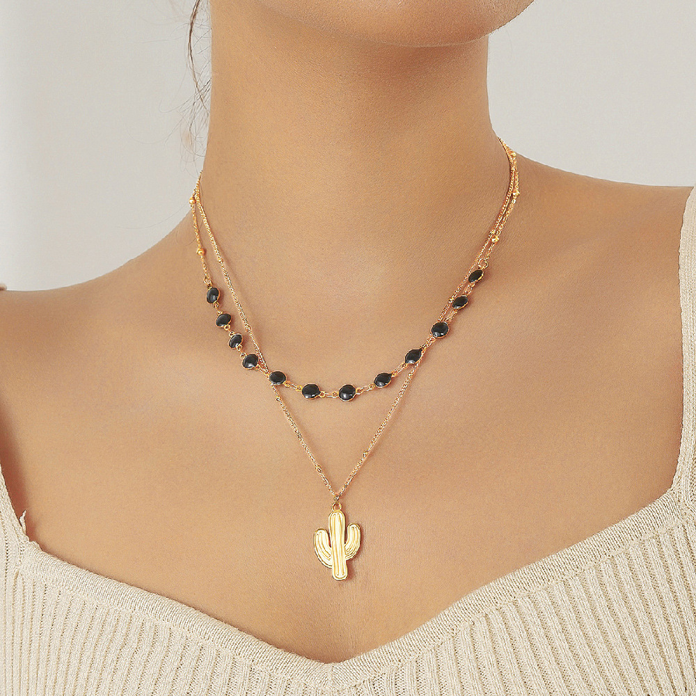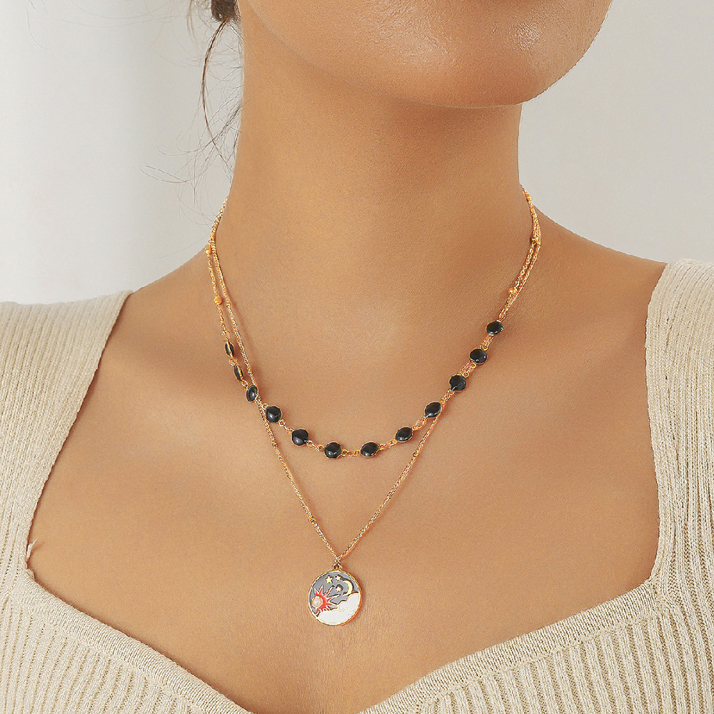 Home > New Arrival > Fashionable and versatile black dotted round accessory heart-shaped pendant sun and moon painted diamond double-layer necklace