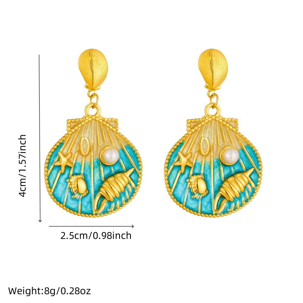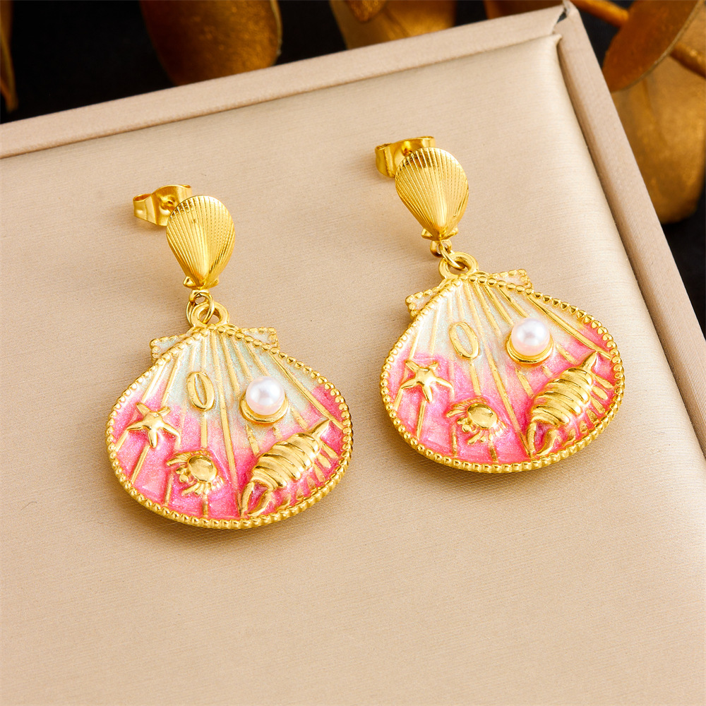 • Fashionable cartoon cute ocean-themed gradient oil drop scallop and starfish shell pendant stainless steel short earrings for women