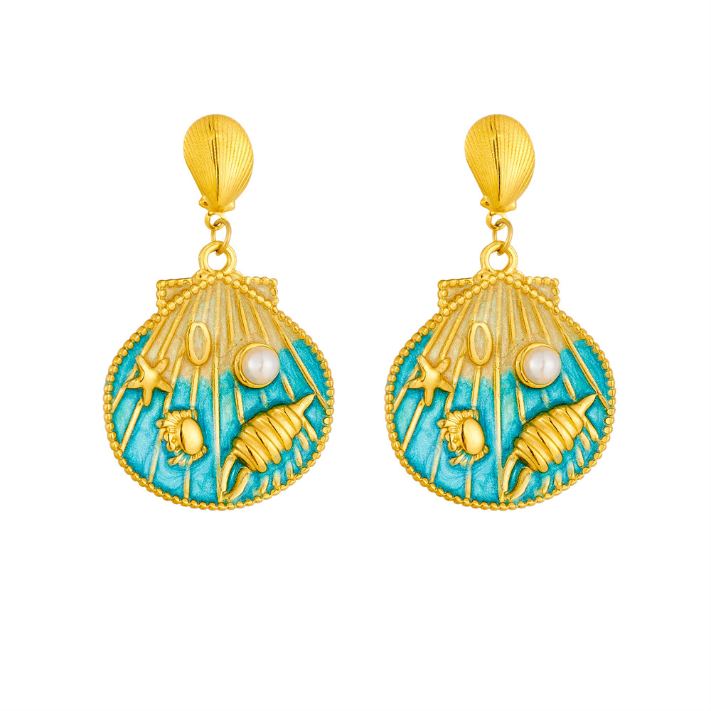 Home > New Arrival > Fashionable cartoon cute ocean-themed gradient oil drop scallop and starfish shell pendant stainless steel short earrings for women