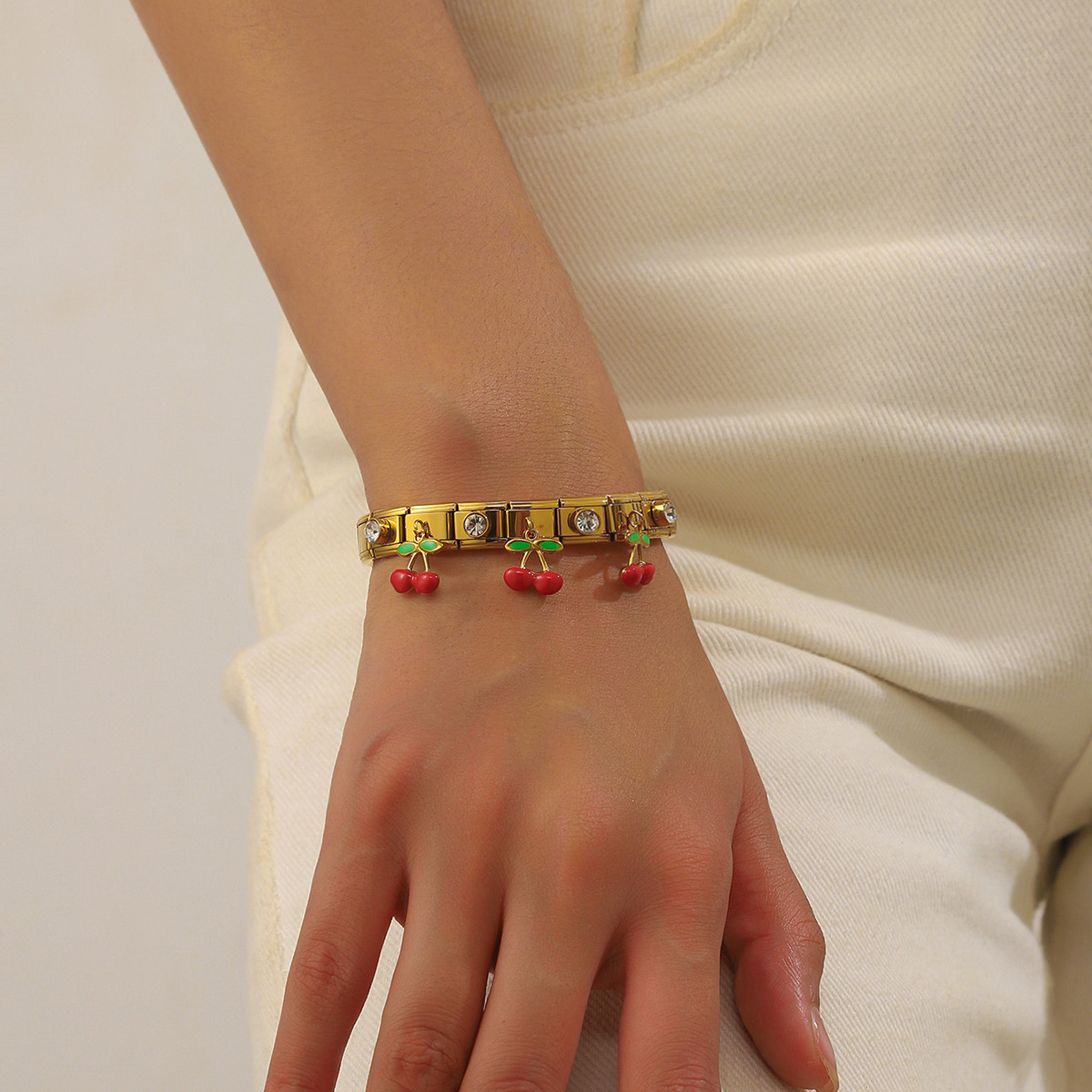 Fashionable cartoon dripping realistic cherry pendant, diamond-encrusted gold-plated stainless steel geometric square round bracelet